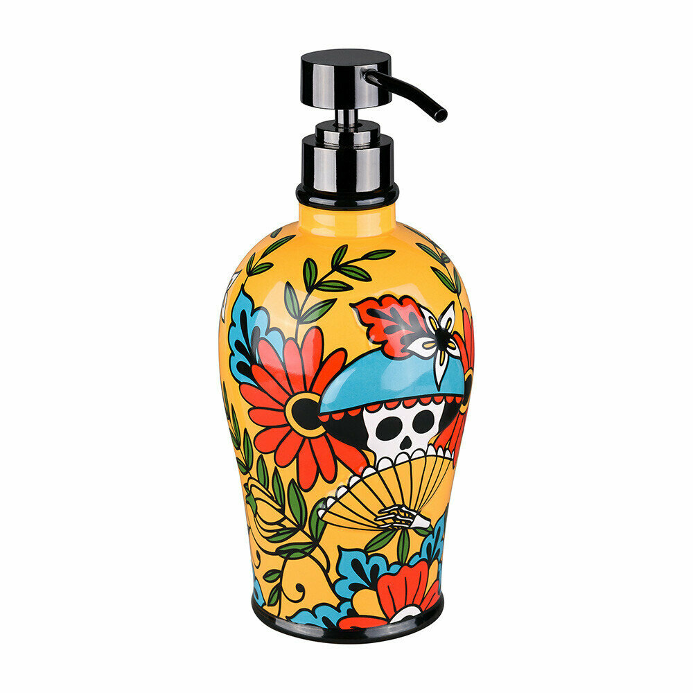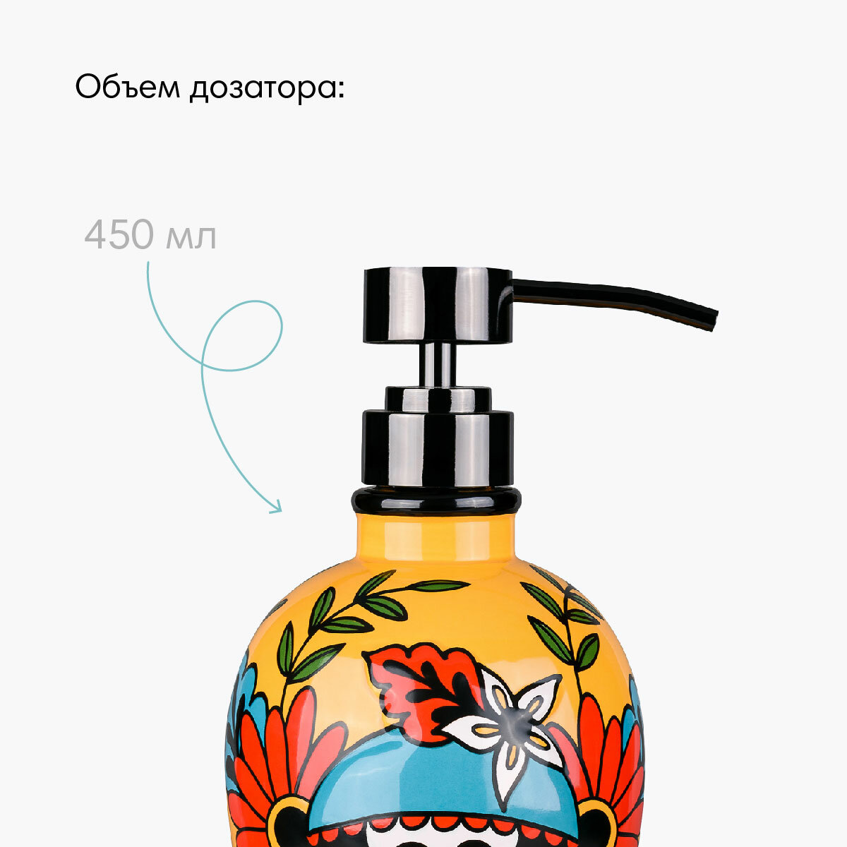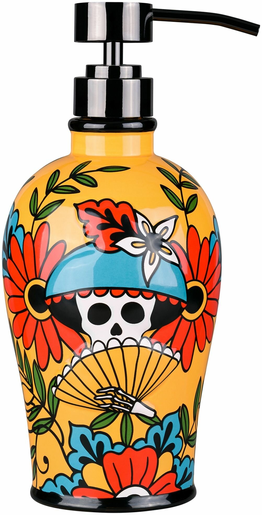 Керамический дозатор для жидкого мыла объемом 450 мл. Большой объем флакона позволяет использовать дозатор не только для жидкого мыла, но и для бальзамов, шампуней, геля для душа. Уникальный дизайн изделия выполнен в стиле одного из главных мексиканских праздников - Дня Мертвых. Дозатор идеально сочетается с остальными предметами коллекции Los Muertos: настольными аксессуарами, ковриками, полотенцами и занавеской для душа.