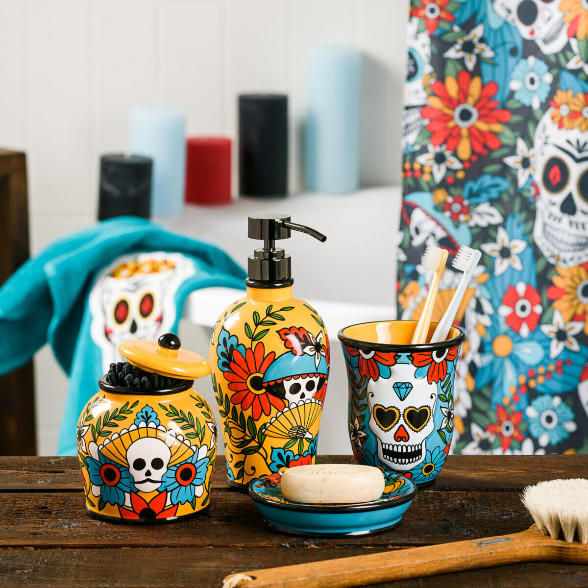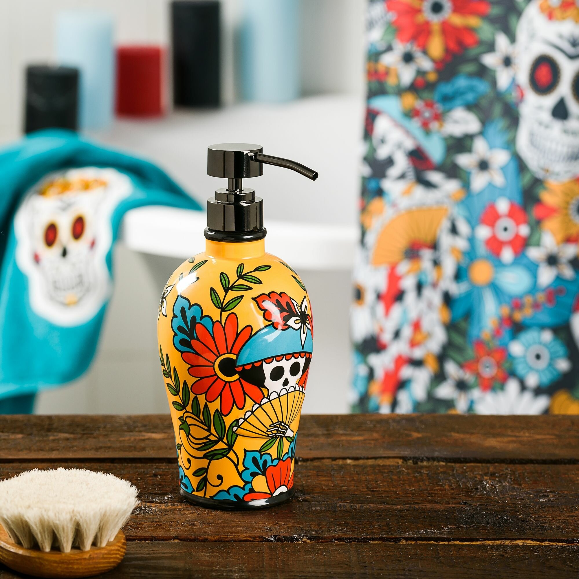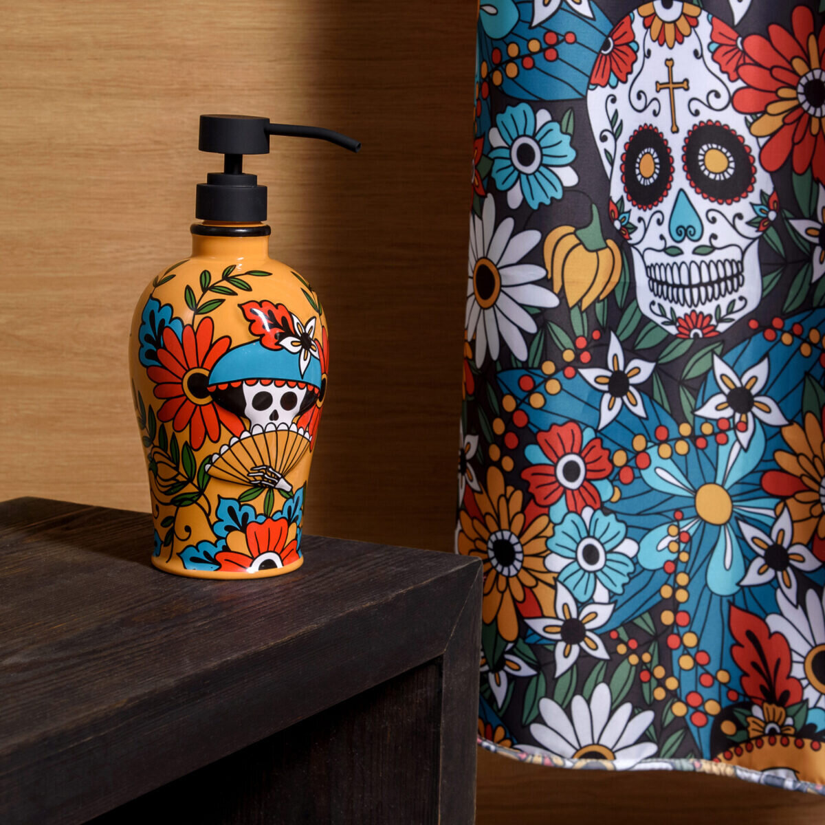 Керамический дозатор для жидкого мыла объемом 450 мл. Большой объем флакона позволяет использовать дозатор не только для жидкого мыла, но и для бальзамов, шампуней, геля для душа. Уникальный дизайн изделия выполнен в стиле одного из главных мексиканских праздников - Дня Мертвых. Дозатор идеально сочетается с остальными предметами коллекции Los Muertos: настольными аксессуарами, ковриками, полотенцами и занавеской для душа.