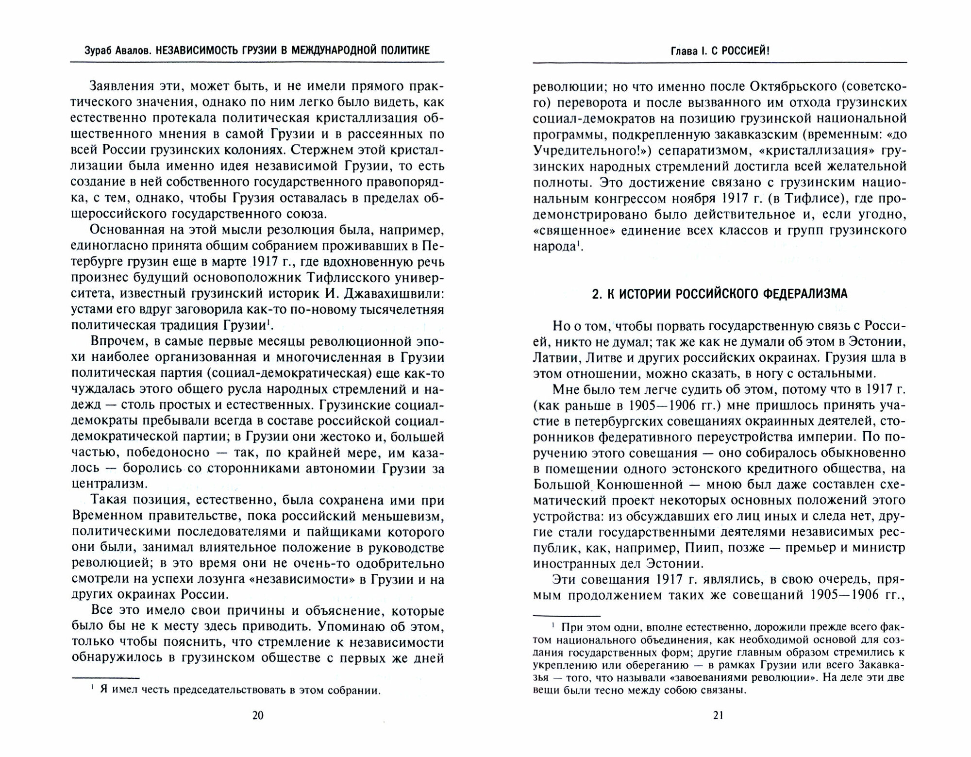Выдающийся грузинский историк, дипломат и политический деятель князь Зураб Давидович Авалов (Авалишвили) в своей книге изложил историю независимой Грузинской Демократической Республики, оказавшейся в 1918 г. на распутье между Западом и Советской Россией. Автор, непосредственный участник событий эпохи, отобразил процесс "самоустроения молодой жизнеспособной демократии" и зарождения независимого грузинского государства, отметив, что в этот период страна была близка к международному признанию своей независимости, а также описал крушение в 1921 г. института представительной демократии Грузии под натиском советской политики и вхождение Грузии в состав СССР.
