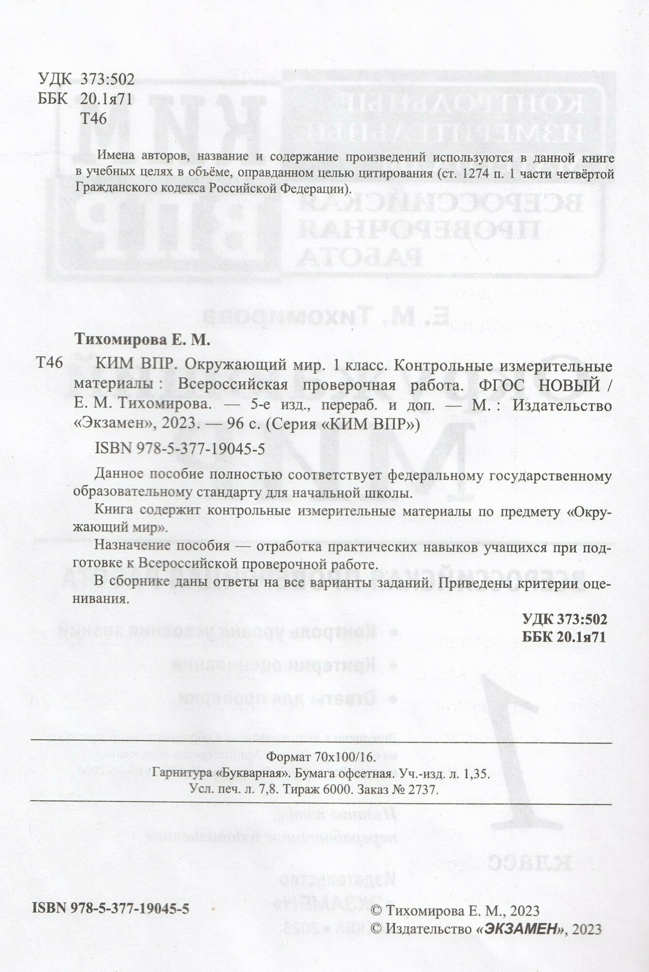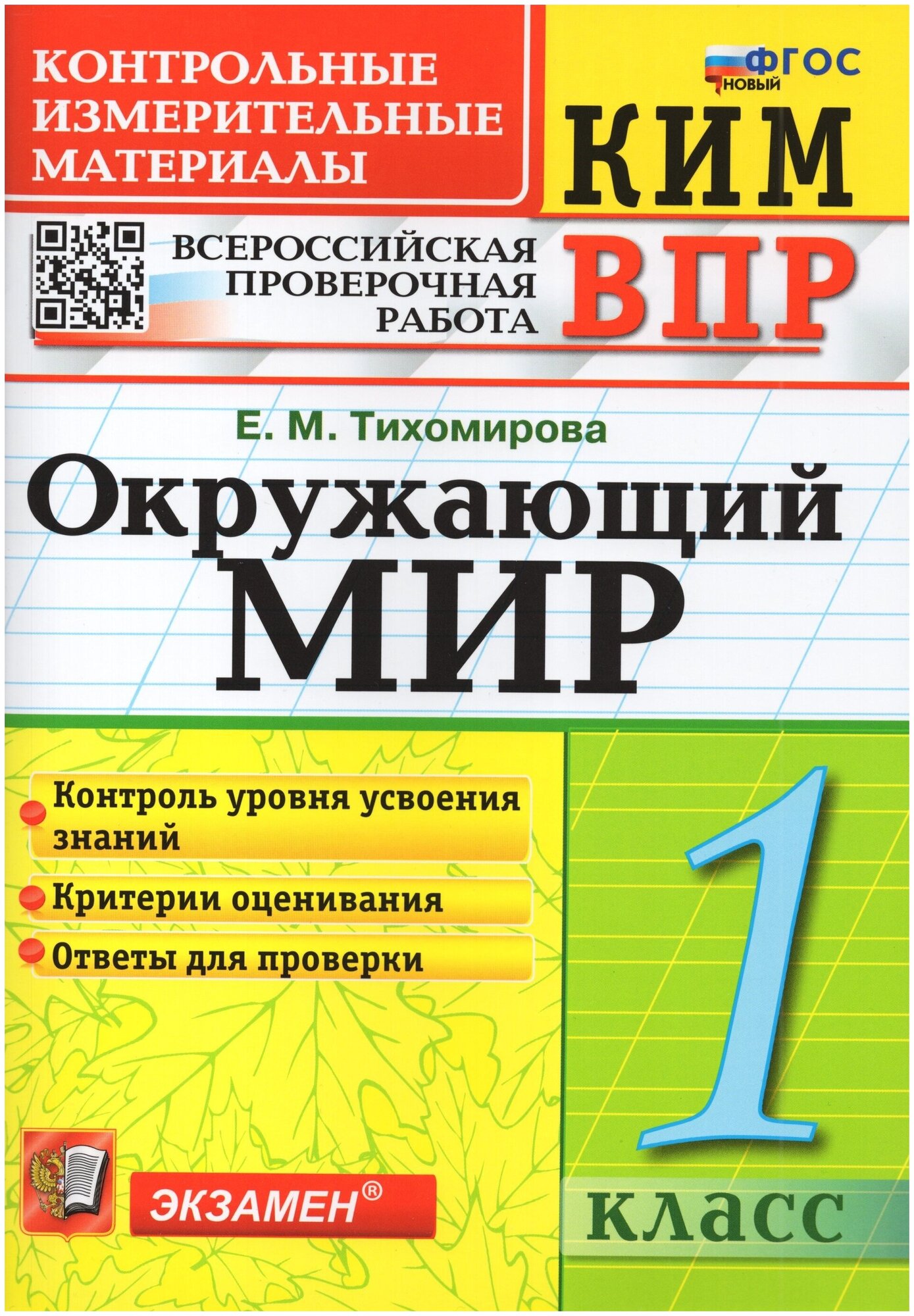 КИМ ВПР. Окружающий мир. 1 класс. Контрольные измерительные материалы: Всероссийская проверочная работа. ФГОС НОВЫЙ (Тихомирова Елена Михайловна); Экзамен, 2023