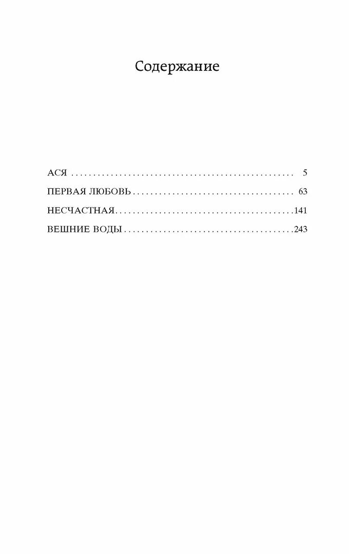 В настоящий сборник вошли повести Ивана Тургенева: «Ася», «Первая любовь», «Несчастная», «Вешние воды». Содержание книги определено не только хронологической, но и внутренней связью этих произведений — темой любви. Тургенев на время как бы оставляет человека наедине с глубинным, изначальным и вечным, обнаруживая в нем всепоглощающую потребность любить. Однако тургеневские повести показали и то, как мало способен быть человек устроителем своего счастья и как «любовь на всякий возраст имеет свои страданья».