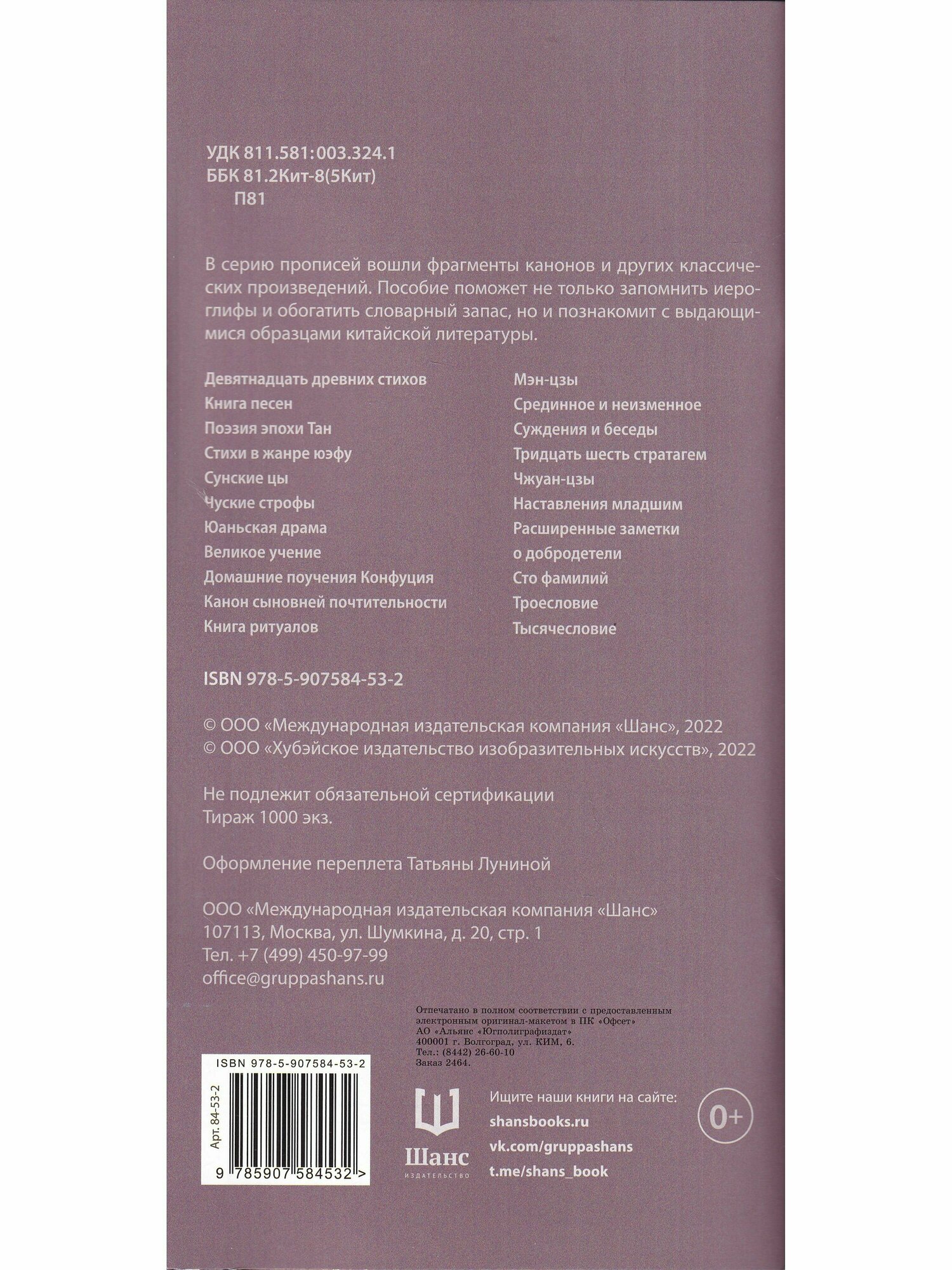 В состав прописей вошли фрагменты канонов и других классических произведений. Пособие поможет не только запомнить иероглифы и обогатить словарный запас, но и познакомит с выдающимися образцами китайской литературы.