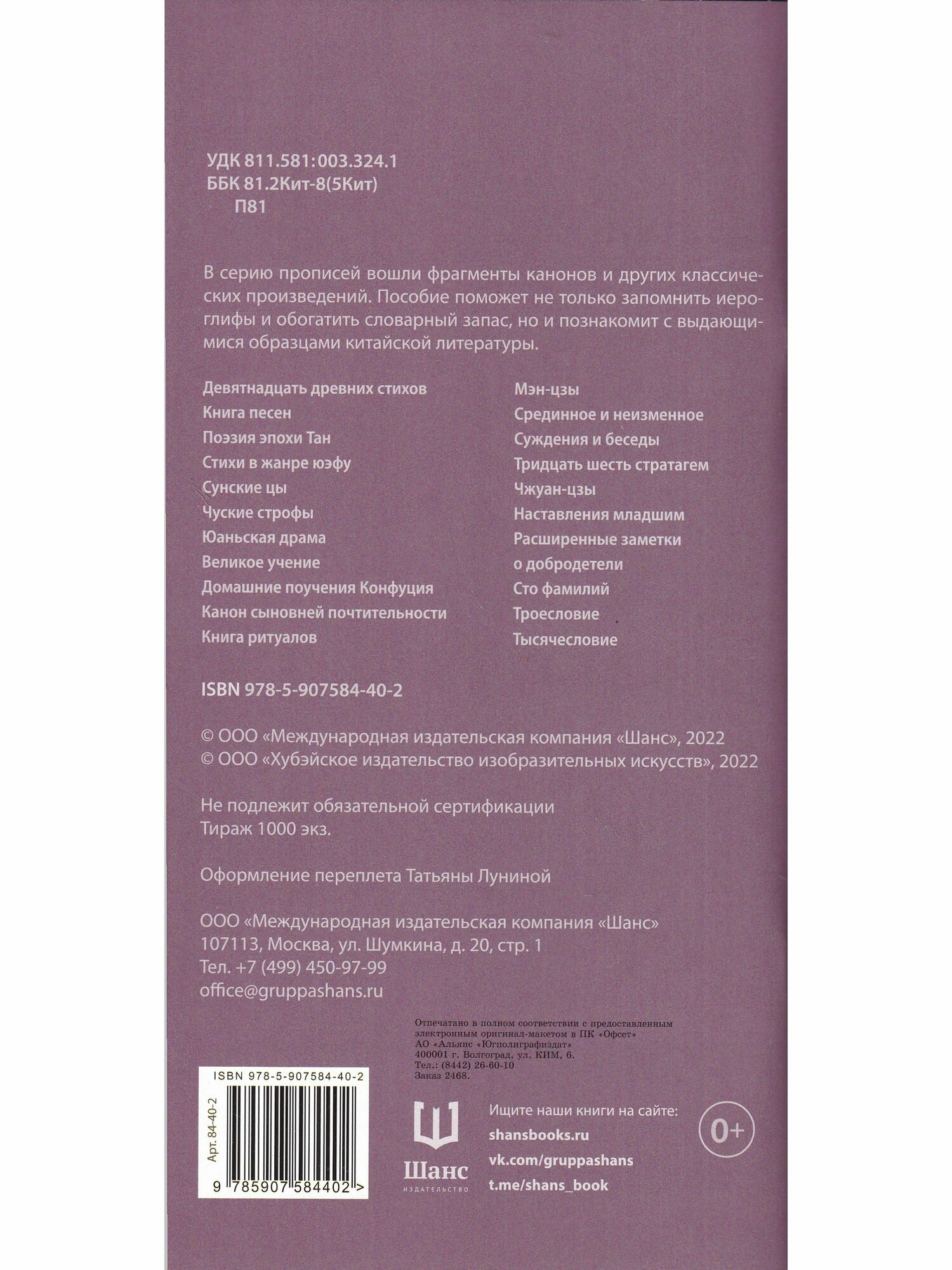 В состав прописей вошли фрагменты канонов и других классических произведений. Пособие поможет не только запомнить иероглифы и обогатить словарный запас, но и познакомит с выдающимися образцами китайской литературы.
