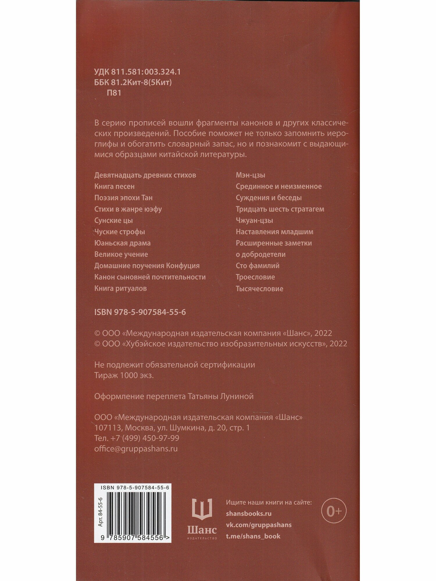 В состав прописей вошли фрагменты канонов и других классических произведений. Пособие поможет не только запомнить иероглифы и обогатить словарный запас, но и познакомит с выдающимися образцами китайской литературы.