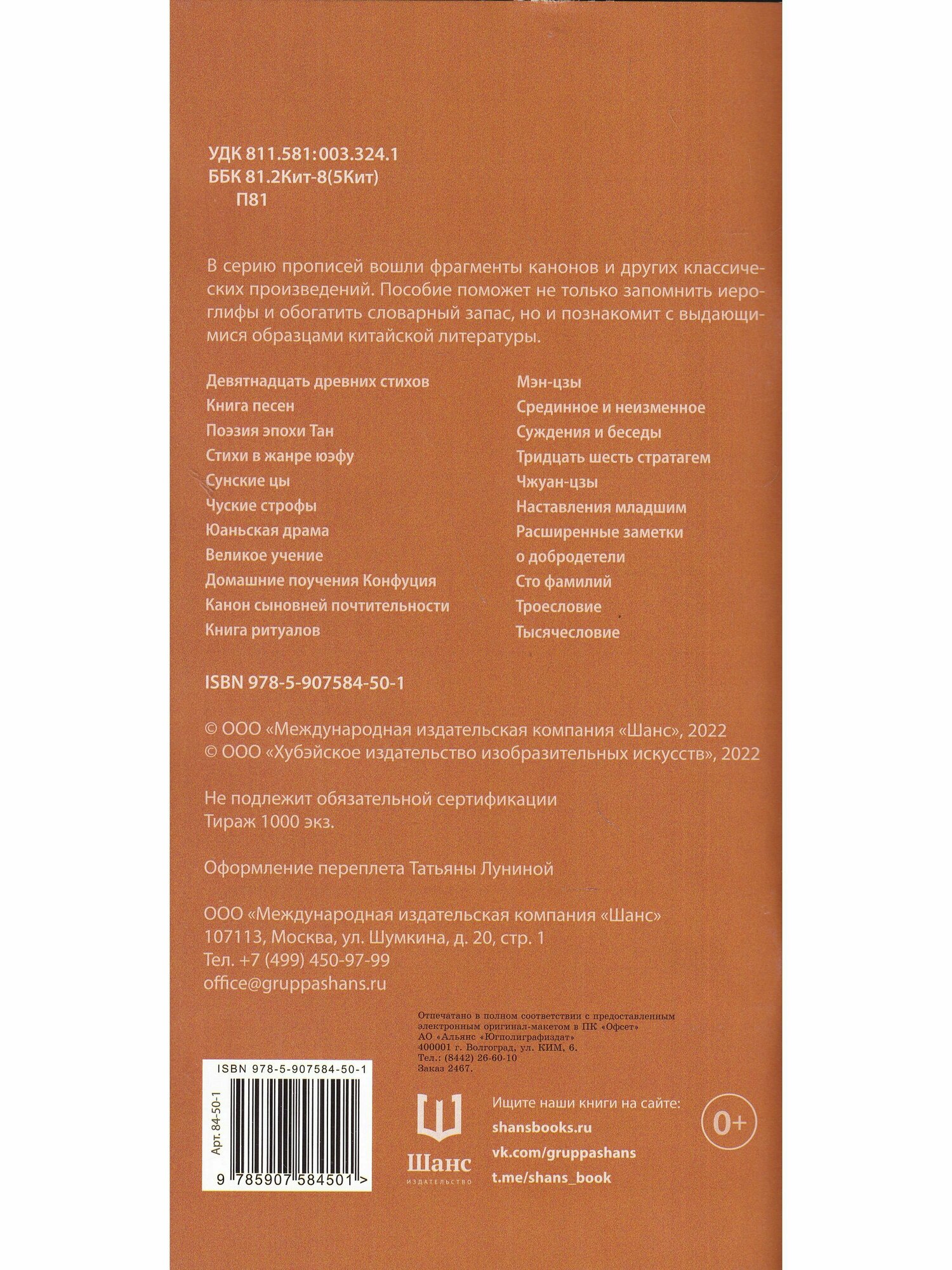 В состав прописей вошли фрагменты канонов и других классических произведений. Пособие поможет не только запомнить иероглифы и обогатить словарный запас, но и познакомит с выдающимися образцами китайской литературы.