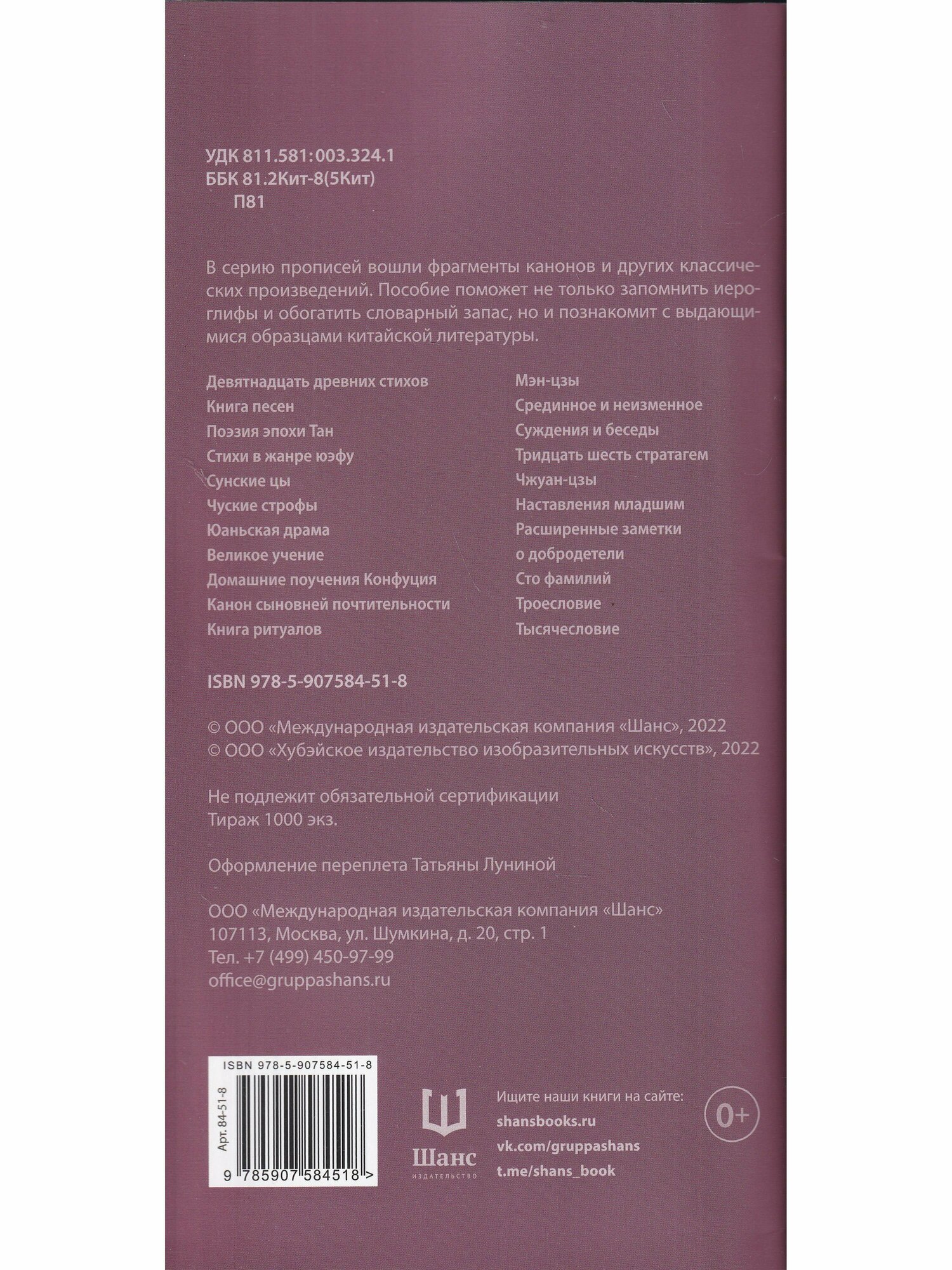В состав прописей вошли фрагменты канонов и других классических произведений. Пособие поможет не только запомнить иероглифы и обогатить словарный запас, но и познакомит с выдающимися образцами китайской литературы.