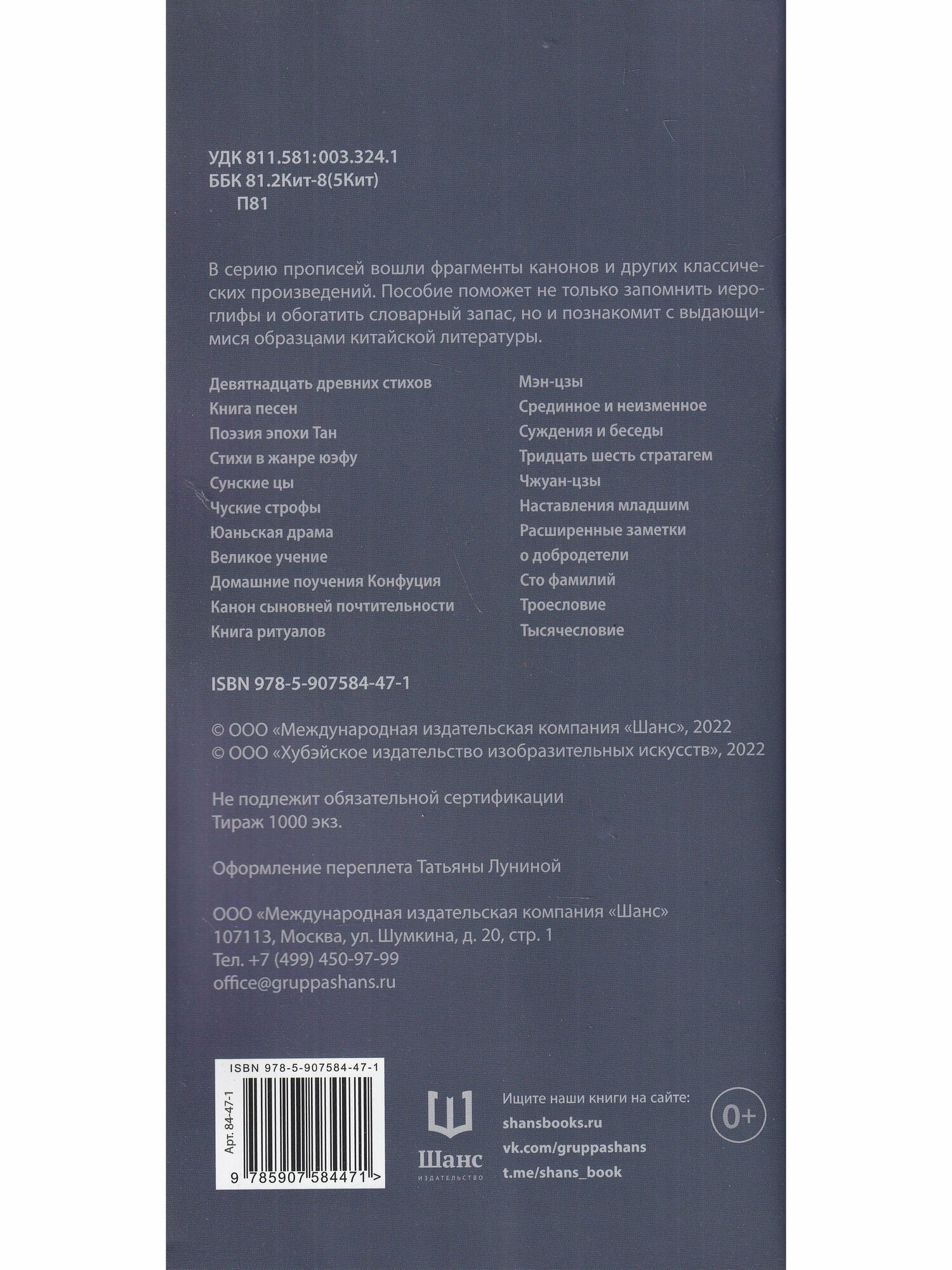 В состав прописей вошли фрагменты канонов и других классических произведений. Пособие поможет не только запомнить иероглифы и обогатить словарный запас, но и познакомит с выдающимися образцами китайской литературы.