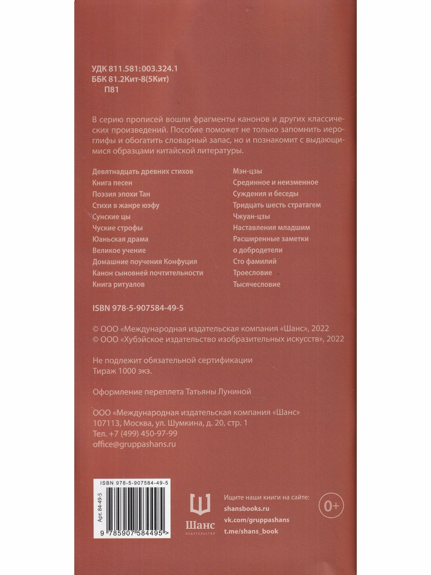 В состав прописей вошли фрагменты канонов и других классических произведений. Пособие поможет не только запомнить иероглифы и обогатить словарный запас, но и познакомит с выдающимися образцами китайской литературы.