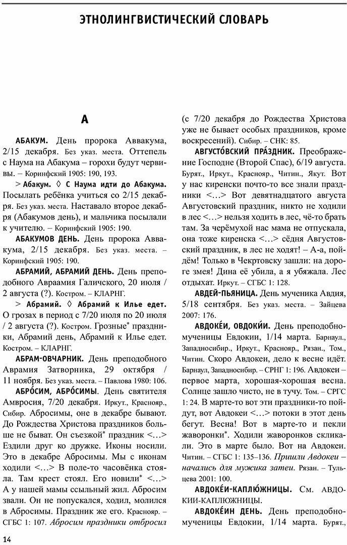 Русский народный календарь является важнейшей частью традиционной культуры. Отрезки или точки календарного времени c давних времён организовывали повседневную жизнь человека в течение всего года. В этнолингвистическом словаре можно найти не только календарные наименования (названия дней, недель, праздников, канунов, постов и т. д.), но и связанные с ними обряды, обычаи, приметы. Собранный материал отражает русскую культурно-языковую традицию XIX–XX веков. Словарь предназначен для всех, кто интересуется языком, историей и культурой русского народа, в том числе для специалистов по лингвистике, фольклористике и этнографии.