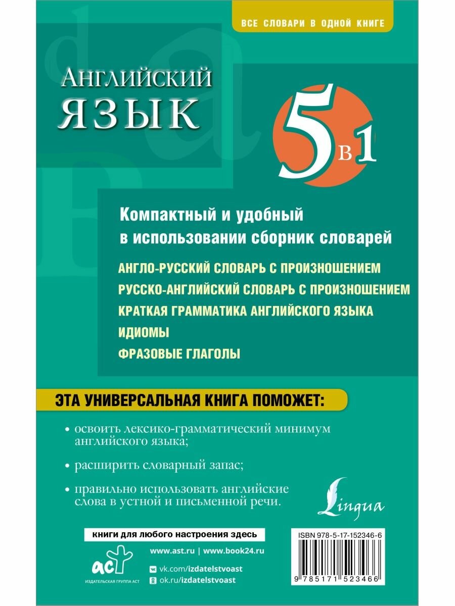 Английский язык 5 в 1. Англо-русский и русско-английский словари с произношением краткая грамматика (Автор не указан); АСТ, 2022