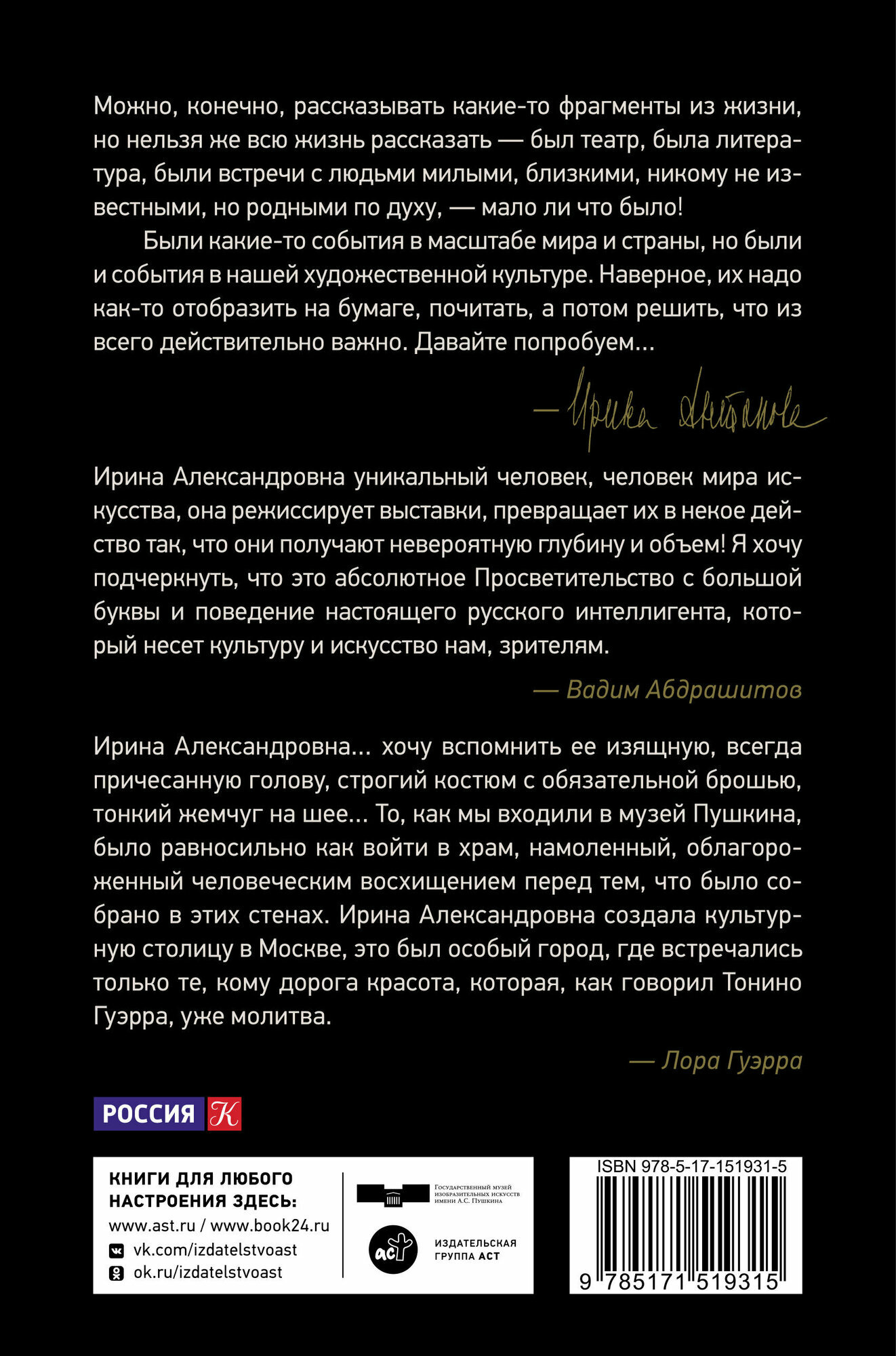 С радостью обнаружила в продаже эту книгу и сразу же купила.Спасибо Читай-городе за эту возможность!Я бесконечно преклоняюсь перед даром рассказчика, повествователя Ирины Антоновой, этой женщины-легенды, очень умной, тонкой, великолепно образованной. Наверное, только она умеет говорить и писать так, чтобы почитатели ловили с жадностью каждое ее слово, каждую мысль.Эта книга, конечно, для своего читателя, для адресной читающей публики.Но этим она и прекрасна!ЧИТАЙТЕ И НАСЛАЖДАЙТЕСЬ!