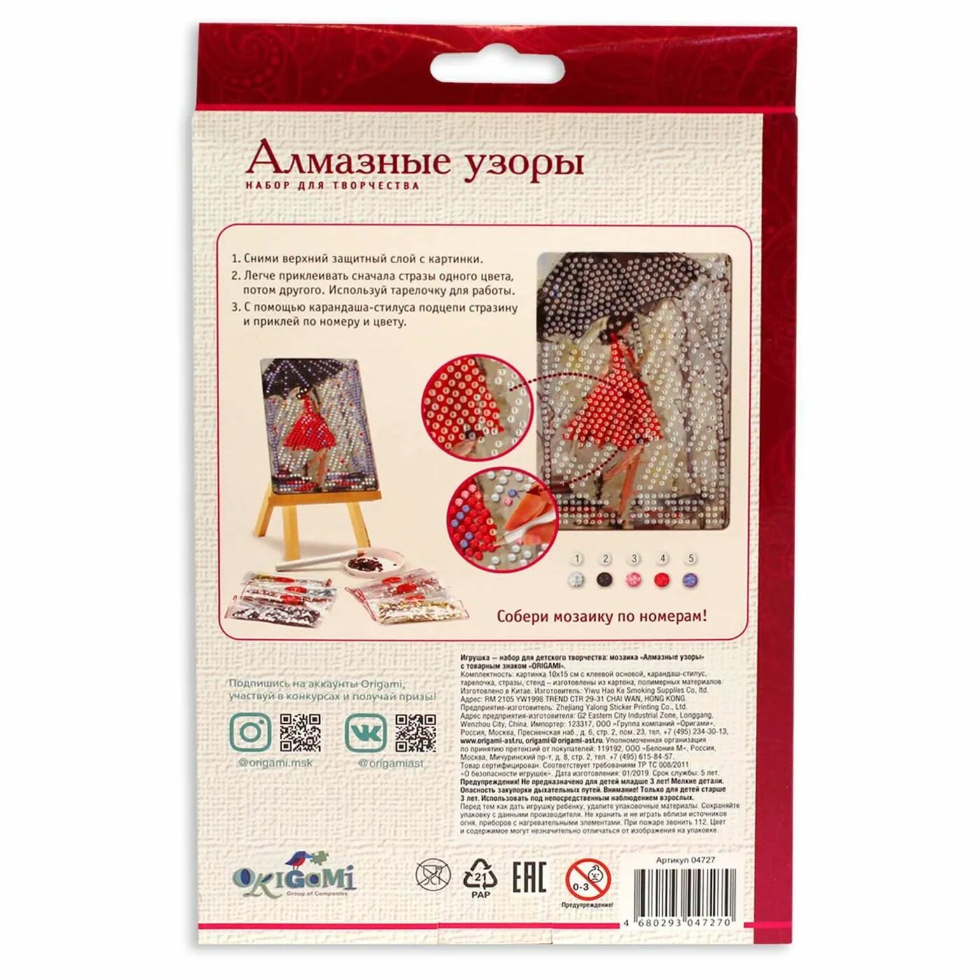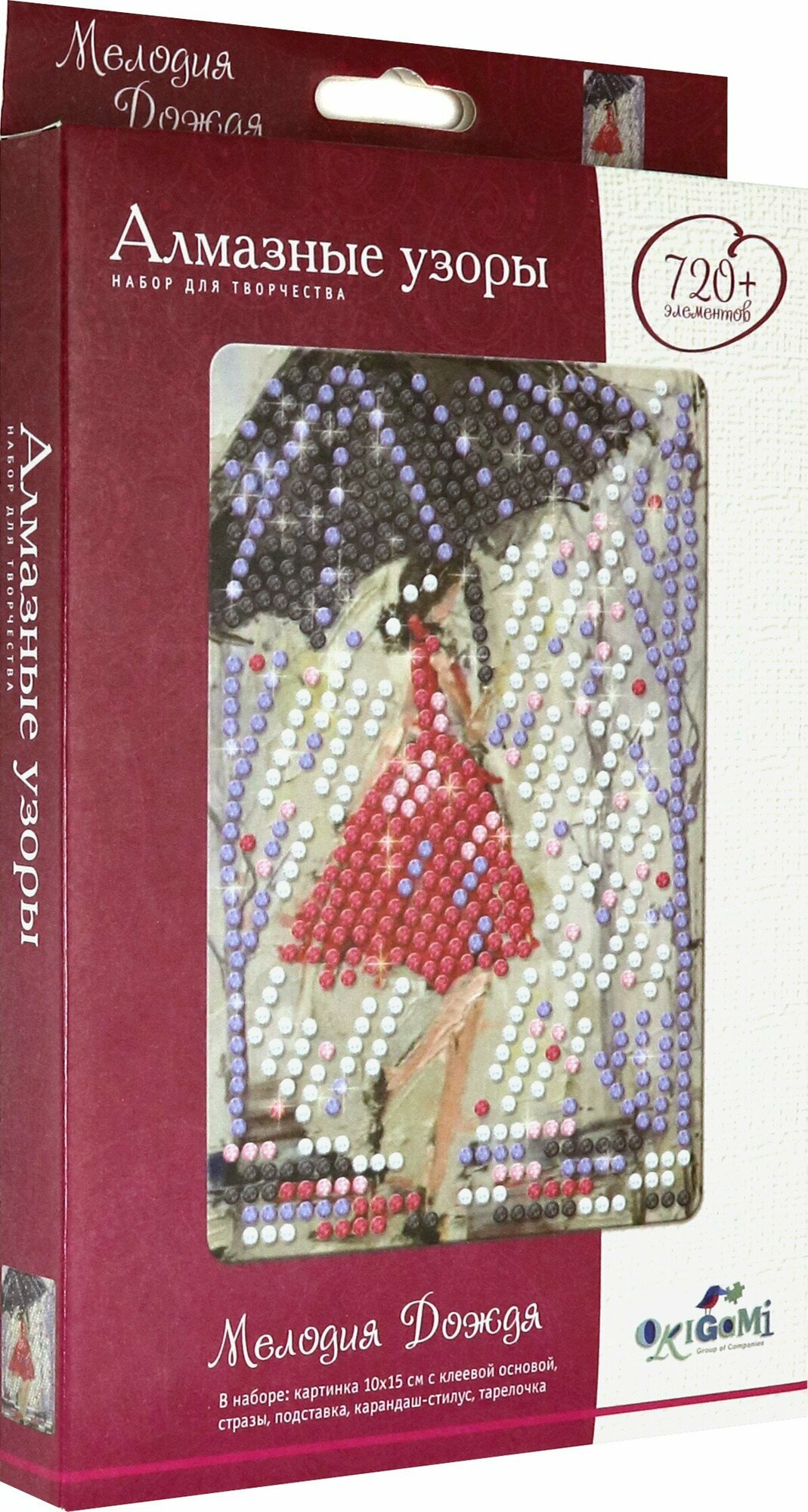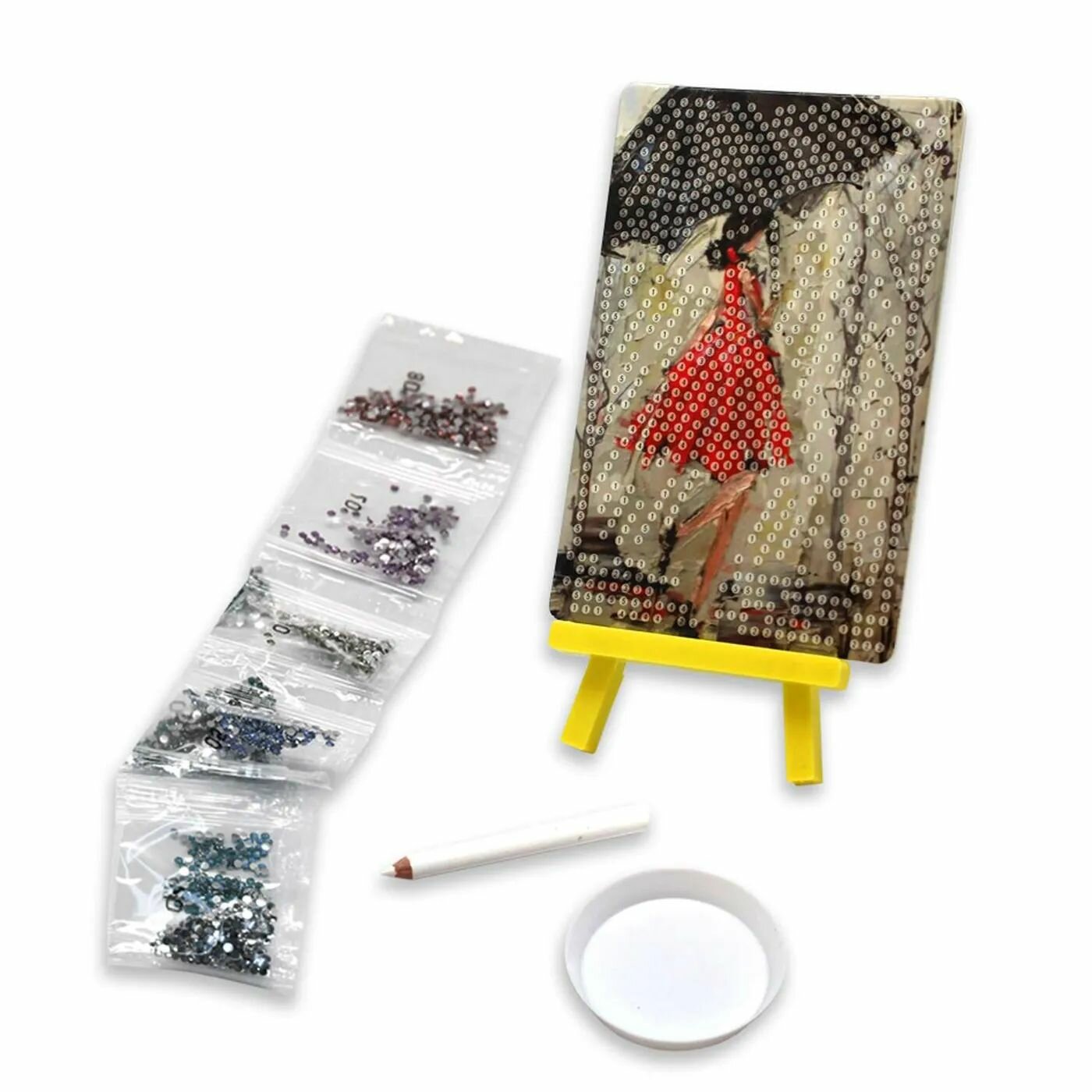 В наборе: картинка с клейкой основой (15 х 10 см), стразы (720+), подставка, карандаш-стилус, тарелочка.