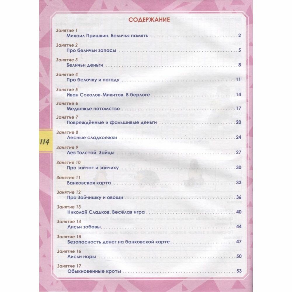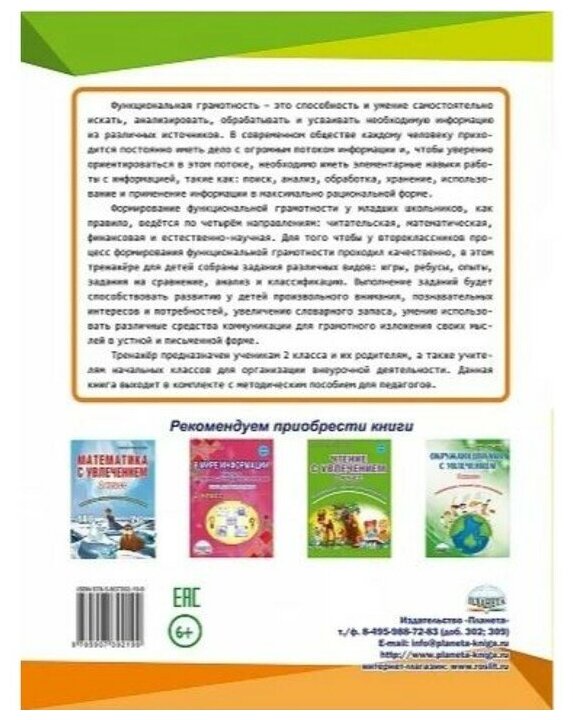 Формирование функциональной грамотности у младших школьников, как правило, ведётся по четырём направлениям: читательская, математическая, финансовая и естественно-научная. Для того чтобы у второклассников процесс формирования функциональной грамотности проходил качественно, в этом тренажёре для детей собраны задания различных видов: игры, ребусы, опыты, задания на сравнение, анализ и классификацию. Выполнение заданий будет способствовать развитию у детей произвольного внимания, познавательных интересов и потребностей, увеличению словарного запаса, умению использовать различные средства коммуникации для грамотного изложения своих мыслей в устной и письменной форме.