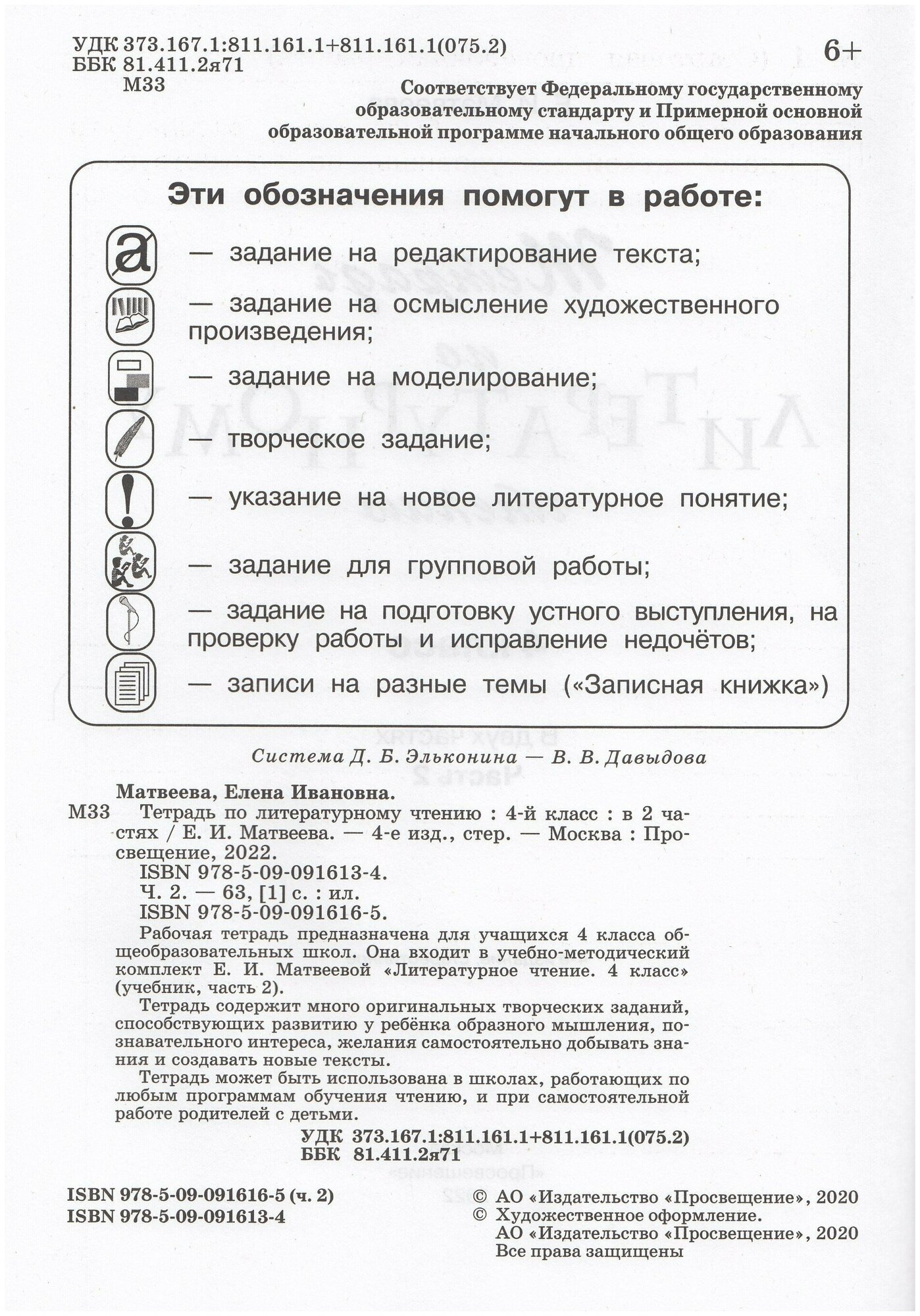 Рабочая тетрадь предназначена для учащихся 4 класса общеобразовательных школ. Она входит в учебно-методический комплект Е. И. Матвеевой «Литературное чтение. 4 класс» (учебник, часть 2). Тетрадь содержит много оригинальных творческих заданий, способствующих развитию у ребёнка образного мышления, познавательного интереса, желания самостоятельно добывать знания и создавать новые тексты. Тетрадь может быть использована в школах, работающих по любым программам обучения чтению, и при самостоятельной работе родителей с детьми.