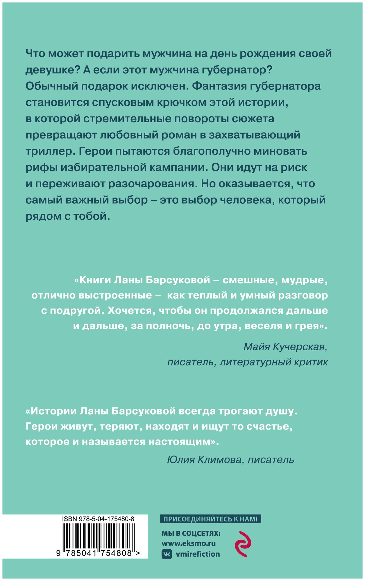 Что может подарить мужчина на день рождения своей девушке? А если этот мужчина губернатор? Обычный подарок исключен. Фантазия губернатора становится спусковым крючком этой истории, в которой стремительные повороты сюжета превращают любовный роман в захватывающий триллер. Герои пытаются благополучно миновать рифы избирательной кампании. Они идут на риск и переживают разочарования. Но оказывается, что самый важный выбор – это выбор человека, который рядом с тобой.