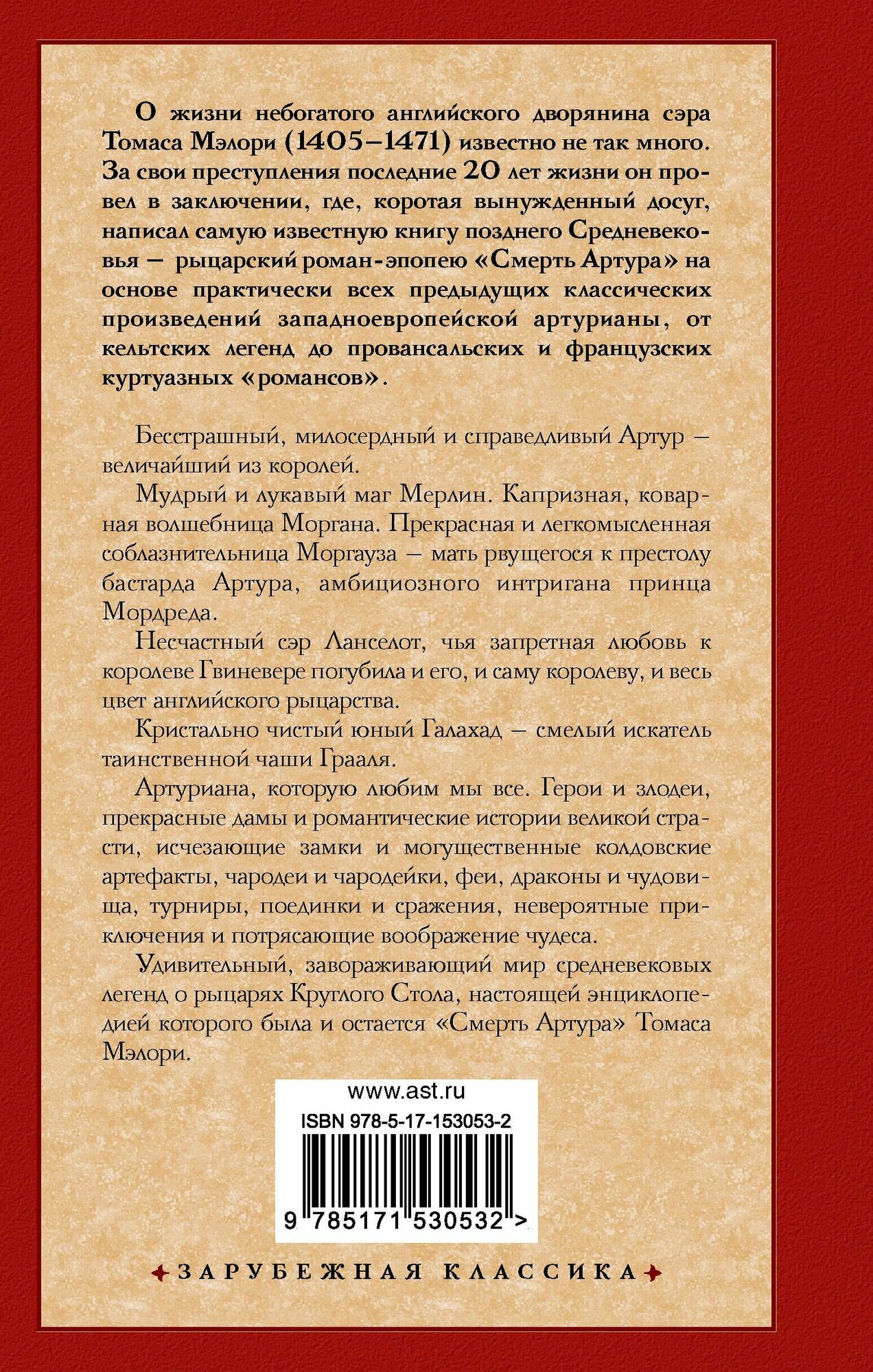 Удивительный, завораживающий мир средневековых легенд о рыцарях Круглого Стола, настоящей энциклопедией которого была и остается "Смерть Артура" Томаса Мэлори.
