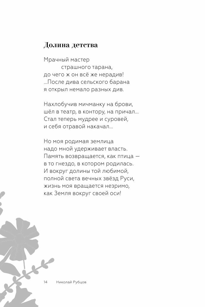 Николая Рубцова часто сравнивают с Сергеем Есениным. В их поэзии и жизни можно найти много общего. Но Рубцов не подражал любимому поэту, он шел своим путем, не менее ярким, но более скромным и тихим. Искренность, задушевность, проникновение во все уголки человеческой души, сопереживание ближнему, умение любить, верить, быть счастливым и радоваться даже малому сделали лирику Н. Рубцова необычайно близкой людям. Недаром на его стихи написано так много песен - и бардовских, и эстрадных: "Я буду долго гнать велосипед…", "В горнице моей светло", "Звезда полей", "Деревенские ночи"… В настоящий сборник вошли самые знаменитые стихотворения Николая Рубцова.