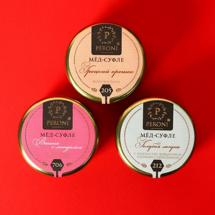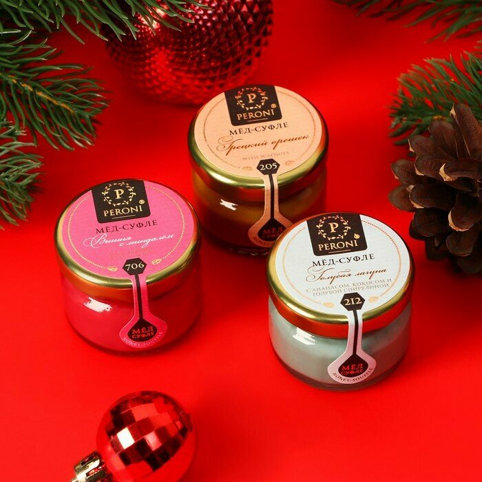 Изысканный сладкий комплимент в красивой подарочной коробочке. В наборе 3 вида мёда: голубая лагуна, вишня с миндалём и грецкий орешек.