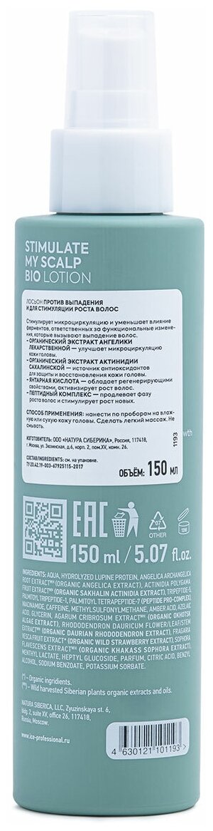 | Полное описание | Стимулирует микроциркуляцию и уменьшает влияние ферментов, ответственных за функциональные изменения, которые вызывают выпадение волос. Органический экстракт ангелики лекарственной — улучшает микроциркуляцию кожи головы Органический экстракт актинидии сахалинской — источник антиоксидантов для защиты и восстановления кожи головы Янтарная кислота — обладает регенерирующими свойствами, активизирует рост волос Пептидный комплекс — продлевает фазу роста волос и стимулирует рост новых |