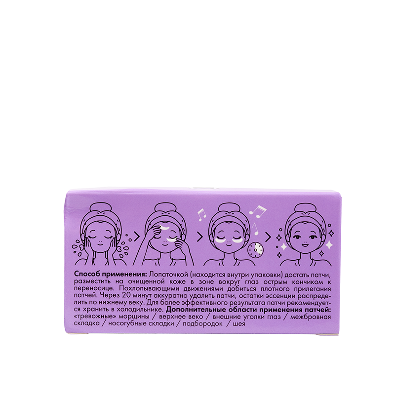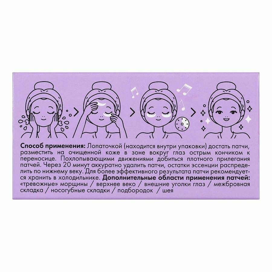 Специальной лопаточкой достаньте патчи и разместите на очищенной коже вокруг глаз острым кончиком к переносице. Похлопывающими движениями добейтесь плотного прилегания. Через 20 мин аккуратно удалите патчи, остатки эссенции распределите по верхнему веку. Для более эффективного результата рекомендуется хранить патчи в холодильнике. В случае появления раздражения - прекратить использование.