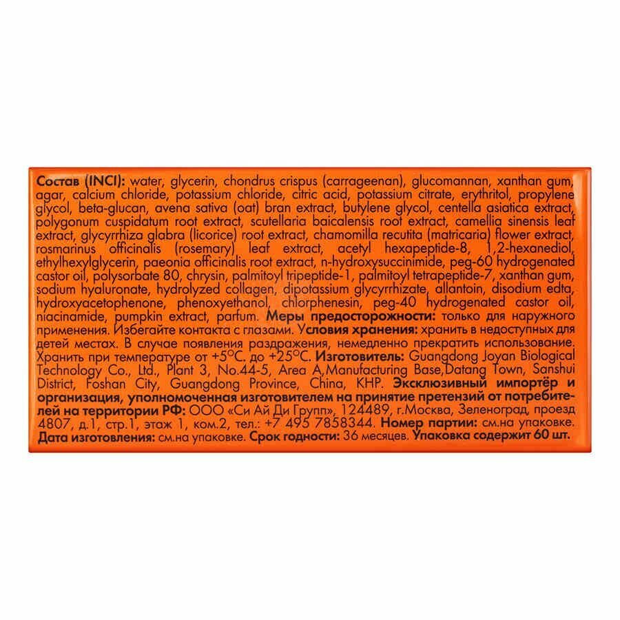 | Состав | water, glycerin, carrageenan, glucomannan, xanthan gum, agar, calcium chloride, potassium chloride, citric acid, potassium citrate, erythritol, propylene glycol, beta-glucan, oat bran extract, butylene glycol, centella asiatica extract, polygonum cuspidatum root extract, scutellaria baicalensis root extract, camellia sinensis leaf extract, licorice root extract, matricaria flower extract, rosemary leaf extract, acetyl hexapeptide-8, 1,2-hexanediol, ethylhexylglycerin, paeonia officinalis root extract, n-hydroxysuccinimide, peg-60 hydrogenated castor oil, polysorbate 80, chrysin, palmitoyl tripeptide-1, palmitoyl tetrapeptide-7, xanthan gum, sodium hyaluronate, hydrolyzed collagen, dipotassium glycyrrhizate, allantoin, disodium edta, hydroxyacetophenone, phenoxyethanol, chlorphenesin, peg-40 hydrogenated castor oil, niacinamide, pumpkin extract, parfum |