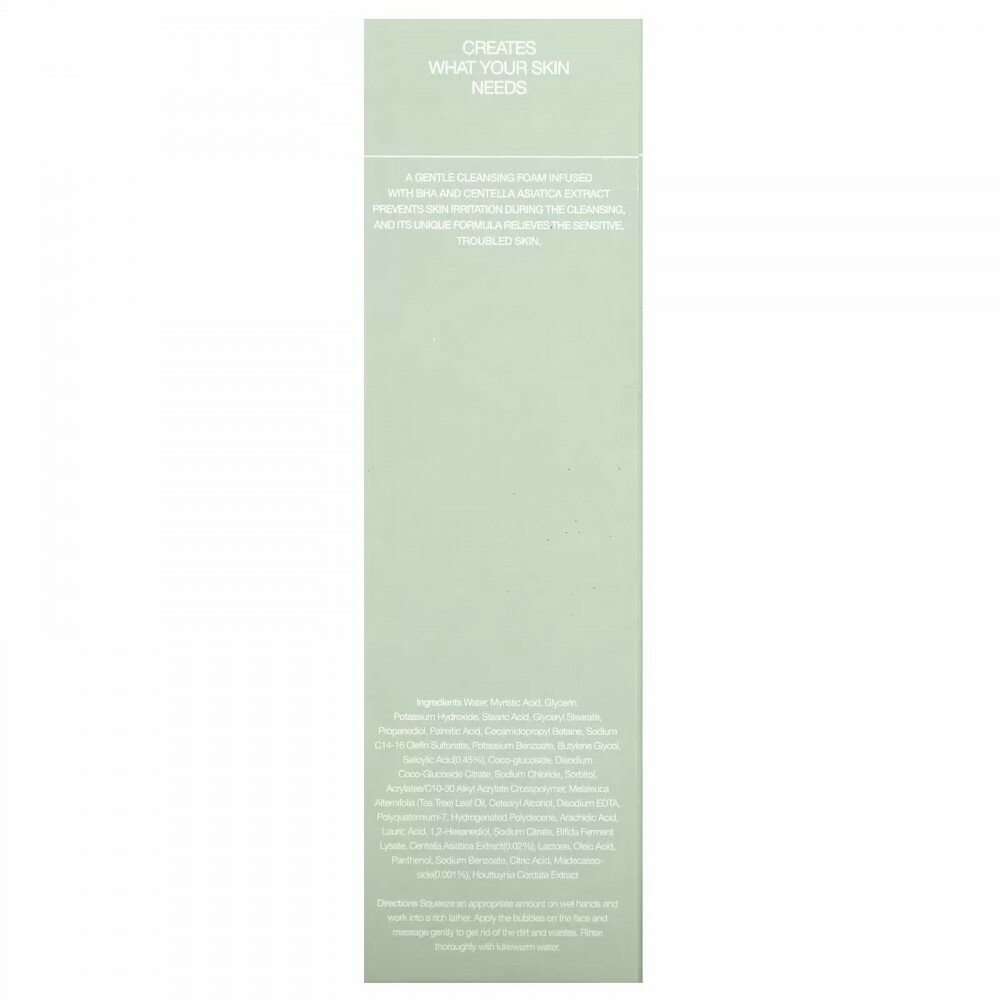 | Состав | Purified water, myristic acid, glycerin, potassium hydroxide, stearic acid, glyceryl stearate, propanediol, palmitic acid, cocamidopropyl betaine, sodium C14-16 olefin sulfonate, potassium benzoate, butylene glycol Lycol, salicylic acid (0.45%), coco-glucoside, disodium coco-glucoside citrate, sodium chloride, sorbitol, acrylate/C10-30 alkyl acrylate crosspolymer, tea tree leaf oil, cetearyl alcohol, Disodium EDITA, Polyquaternium-7, Hydrogenated Polydecene, Arachidic Acid, Lauric Acid, 1,2-hexanediol, Sodium Citrate, Bifida Ferment Lysate, Centella asiatica extract (0.02%), Lactose, Oleic Acid, Panthenol, Sodium Benzoate, Citric Acid, Madecassoside (0.001%), Mildew Extract |