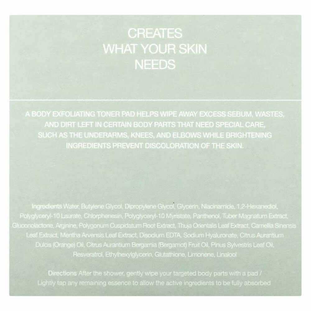 Диски бережно отшелушивают и осветляют кожу подмышек, локтей и коленей. Активные компоненты в составе осветляют пигментацию и успокаивают кожу, раздраженную бритьем, дезодорантами и тесной одеждой. PHA-кислоты мягко и в то же время эффективно удаляют омертвевшие клетки, а комплекс масел смягчает и увлажняет кожу. Без спирта и парабенов. В упаковке — 60 дисков, пропитанных осветляющей формулой.
