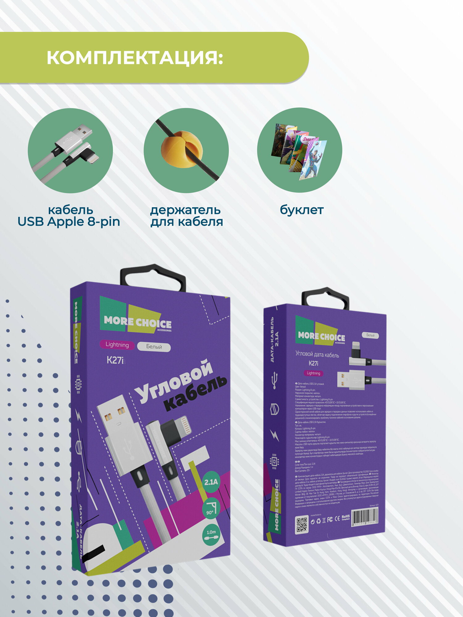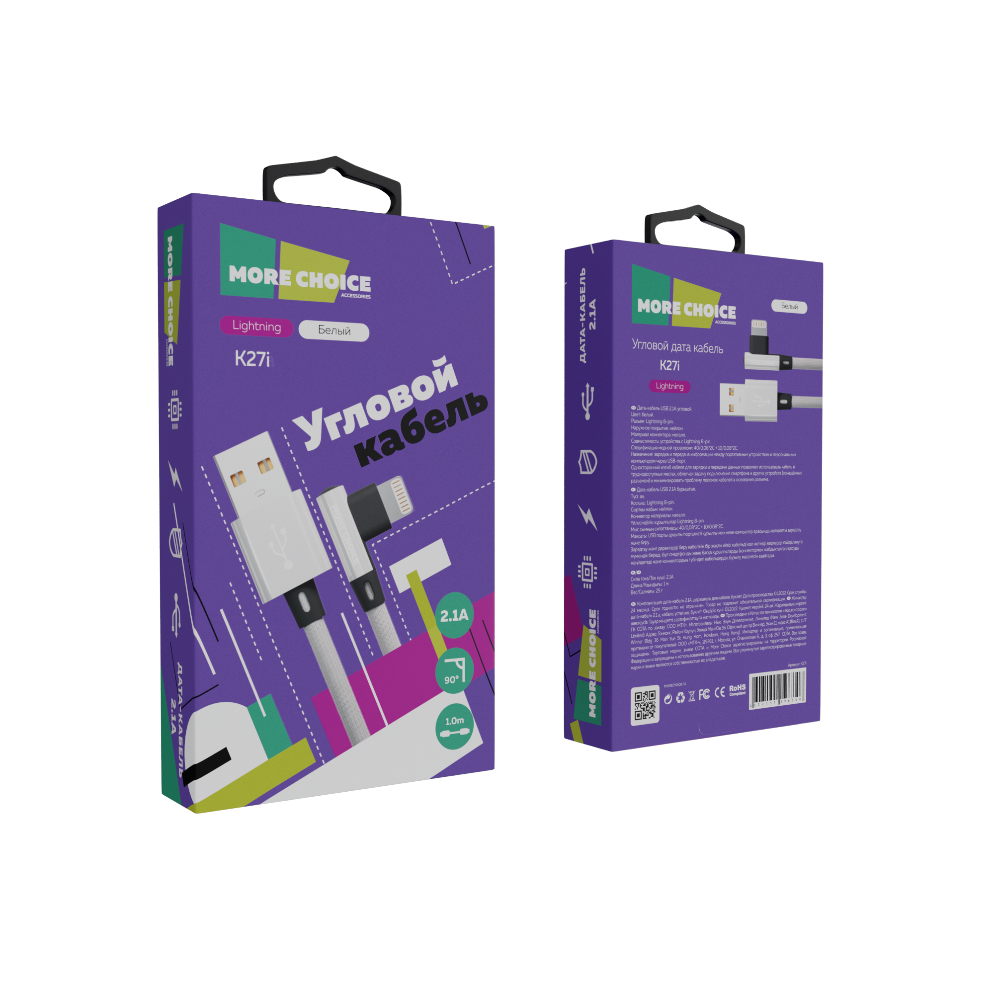 Кабель K27i угловой USB 2, 1A, предначен для зарядки и передачи данных между портативным устройствои и персональным компьютером через USB порт. Односторонний изгиб кабеля позволяет использовать кабель в труднодоступных местах. Наружное покрытие: нейлон, Материал коннектора: металл, Спецификация медной проволоки:40/0, 082С+10/0, 082С, Комплектация: дата кабель, держатель для кабеля, буклет. Длина кабель 1м.