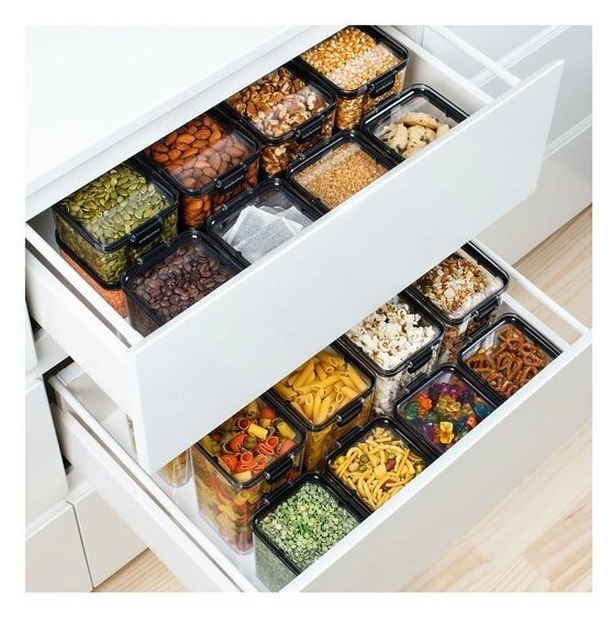 Благодаря крышке, которая плотно закрывается фирменными клипсами, внутрь не попадает воздух. Контейнер подходит для бакалеи, орехов, сладостей.