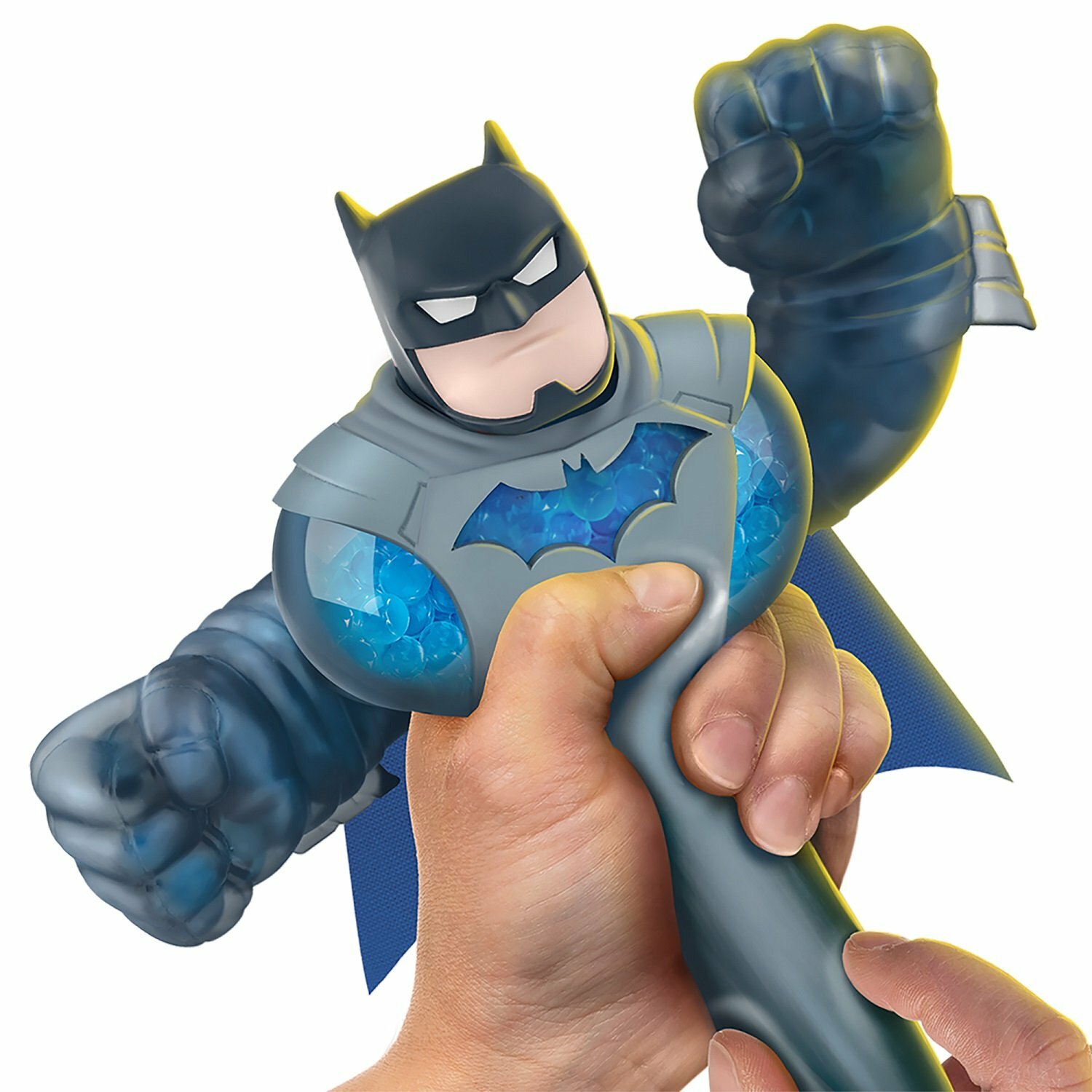 Тянущаяся фигурка Бэтмен 2.0. DC ТМ Гуджитсу приятна на ощупь, растягивается в 3 раза. Игрушка высотой 12 см в новом костюме и тканевом плаще наполнена синими полимерными шариками. Состав: ТПР, ПВХ, пластик (АБС, акрил). вода. Товар сертифицирован и безопасен для детского использования. Упаковка: пауч (19,5 х 6 х 24 см).