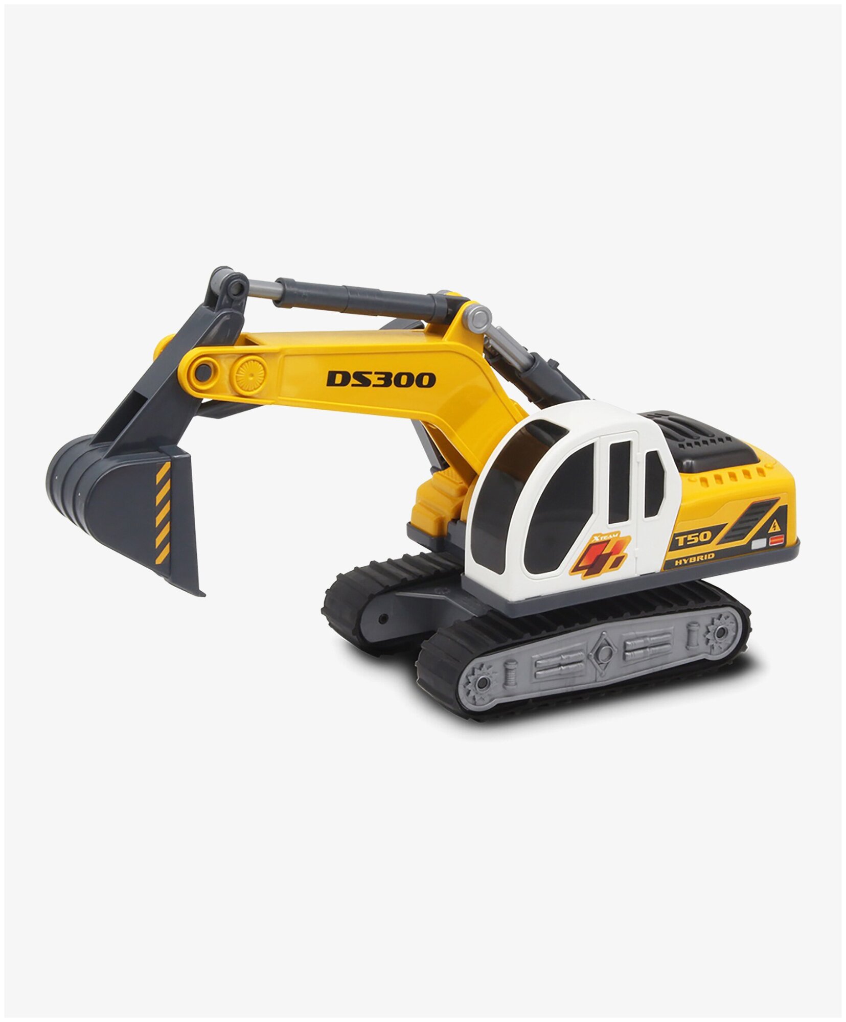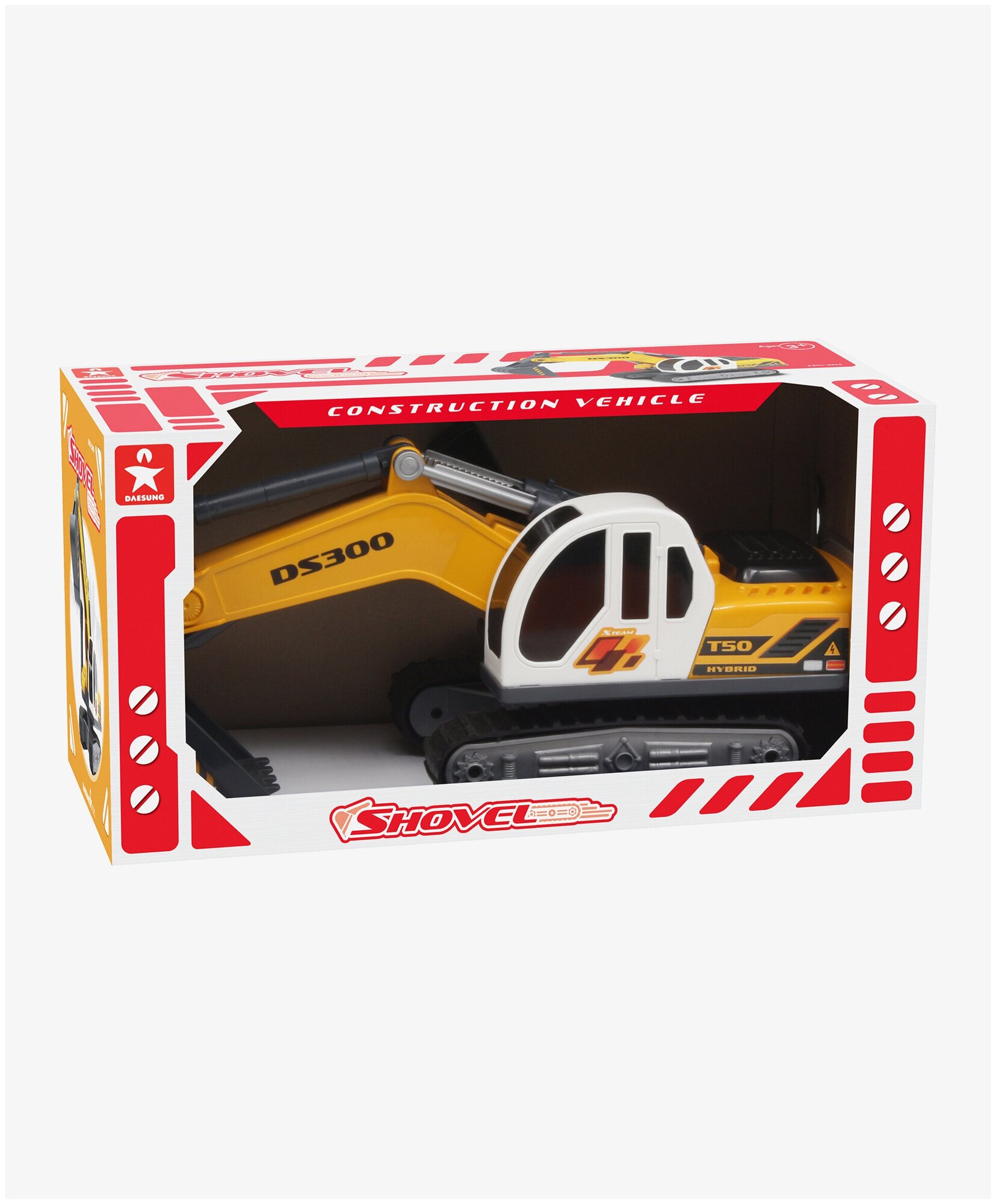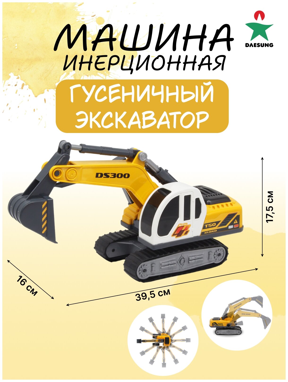 Игрушка Гусеничный экскаватор Дасунг длиной 39,5 см имеет вращающуюся кабину, рычаг для управления ковшом и резиновую гусеницу. Состав: пластик (АБС), ТПР, элементы из металла. Товар сертифицирован и безопасен для детского использования. Упаковка: открытая коробка (40 х 17,5 х 18 см).