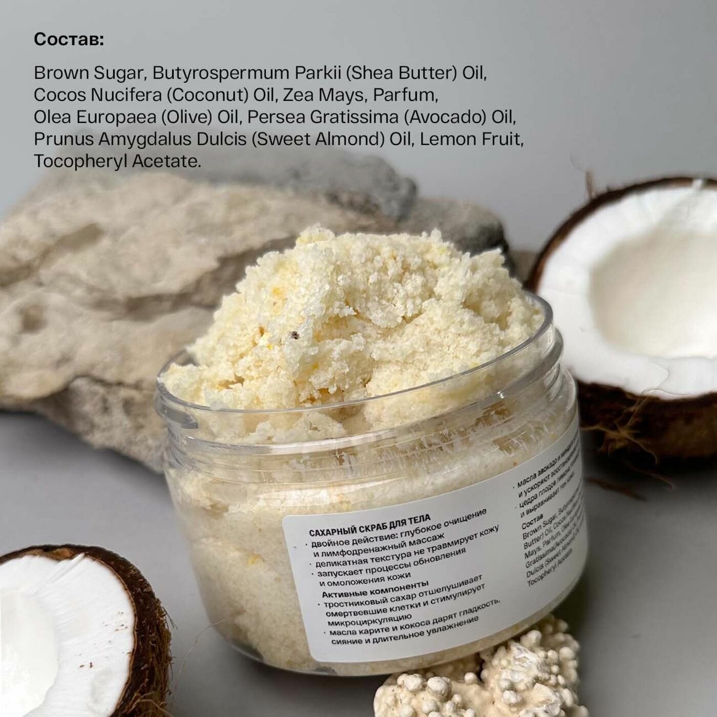 | Состав | тростниковый сахар, масло карите, масло кокоса, зерна кукурузы, отдушка, масло оливы, масло авокадо, масло сладкого миндаля, цедра плодов лимона, токоферил ацетат |