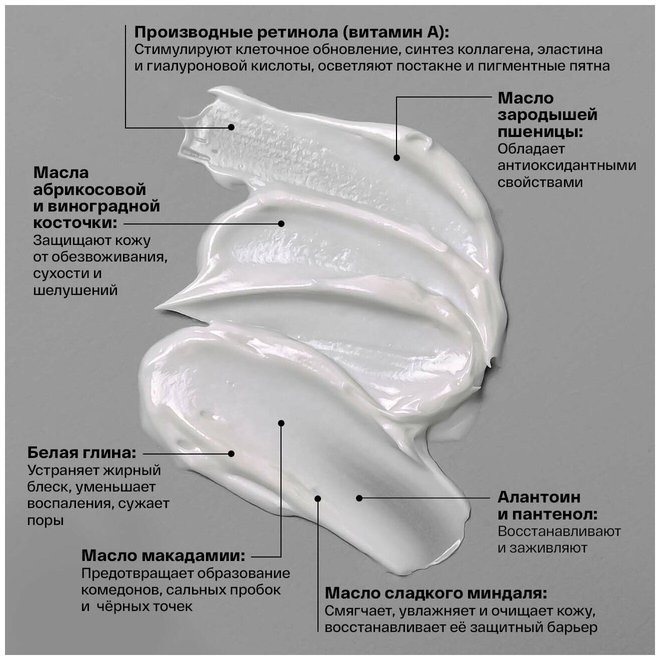 Производные ретинола (витамин А): Обладает комплексным воздействием: ускоряет отшелушивание и обновление кожи, способствует осветлению (пост-акне, пигментации, чёрных точек) и сужению пор, стимулирует активное омоложение – синтез коллагена, эластина и гиалуроновой кислоты.