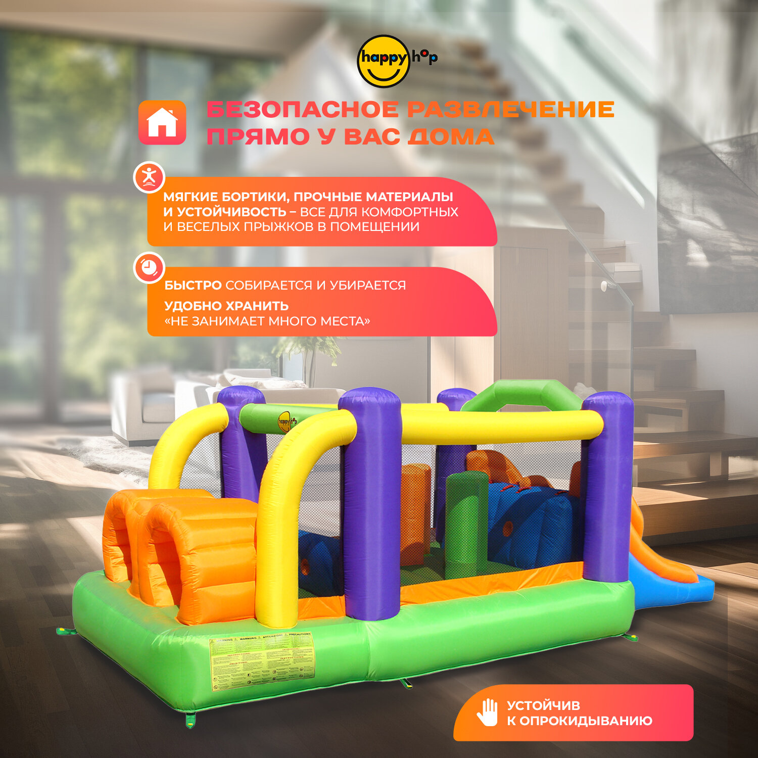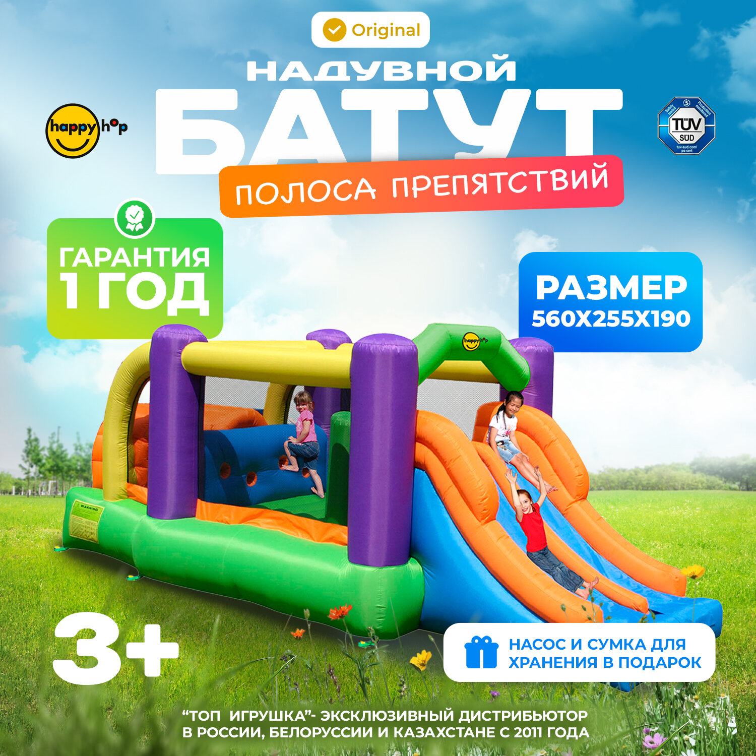 Happy Hop 9063 Полоса препятствий Надувной батут Happy Hop 9063 это целый игровой комплекс у вас дома или на даче. Благодаря большим размерам на нем могут весело играть до 4 детей не мешая друг другу. Батут предоставляет практически неограниченный простор для фантазий во время детских игр. Можно устраивать детские соревнования при прохождении полосы препятствий. Также есть горка. Мягкий материал исключает возможность получения травм.