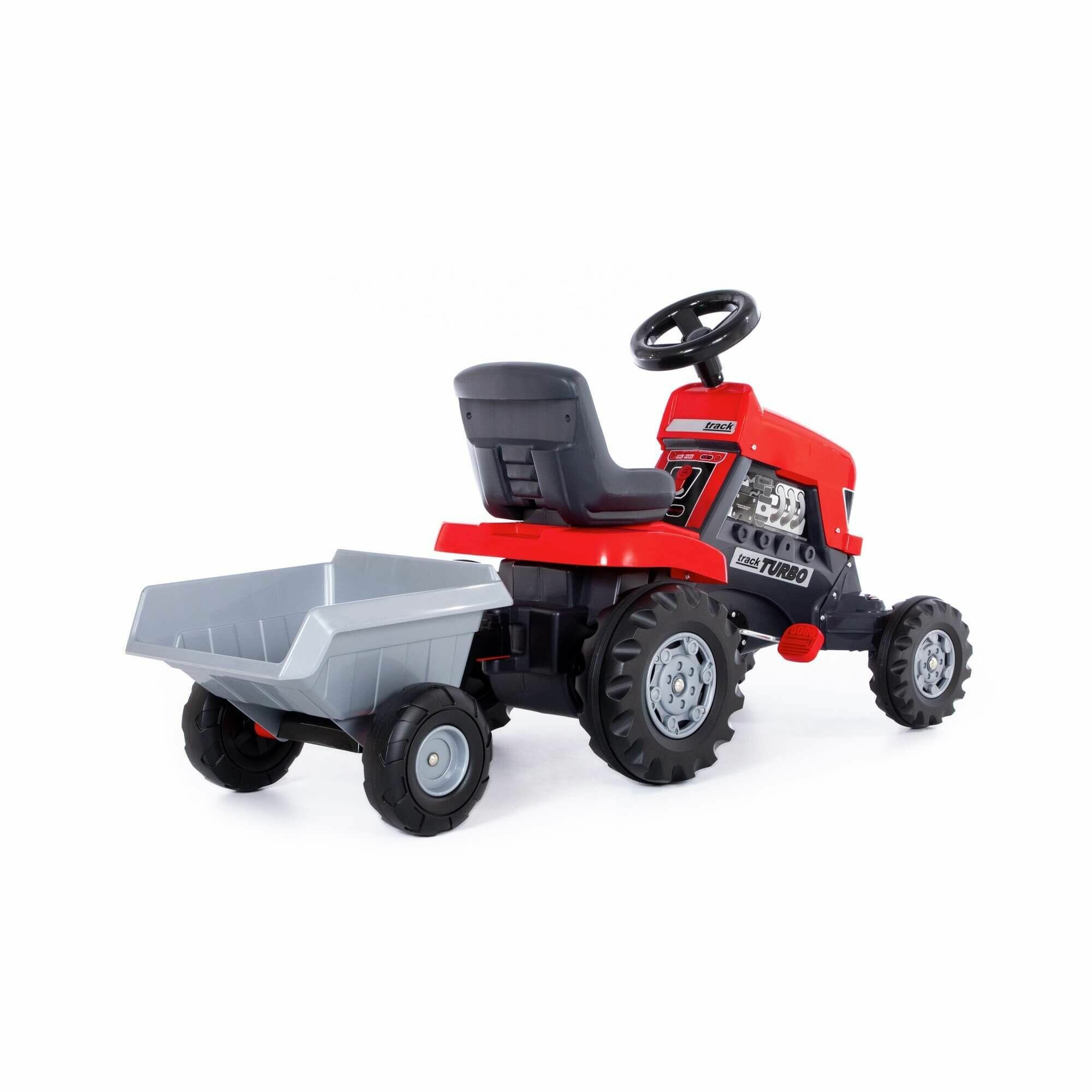 Каталка «Turbo» действительно похожа на трактор. Реалистичность добавляют руль, высокое сиденье со спинкой и изображение внутреннего механизма. Массивные колеса с глубоким протектором позволяют передвигаться по бездорожью. С такой серьезной техникой малыш почувствует себя взрослым работником, будет ответственно помогать вам во дворе дома или на дачном участке. Каталка с педальным механизмом легко управляется с помощью руля.