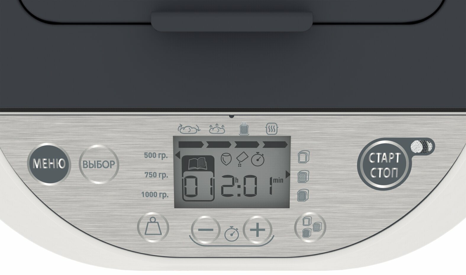 | Программы приготовления | Безглютеновый хлеб, Варенье, Выпечка, Йогурт, Каша, Кекс без глютена, Крупы, Основной быстрый (хлеб), Пирог, Питьевой йогурт, Ржаной хлеб, Ручная настройка |