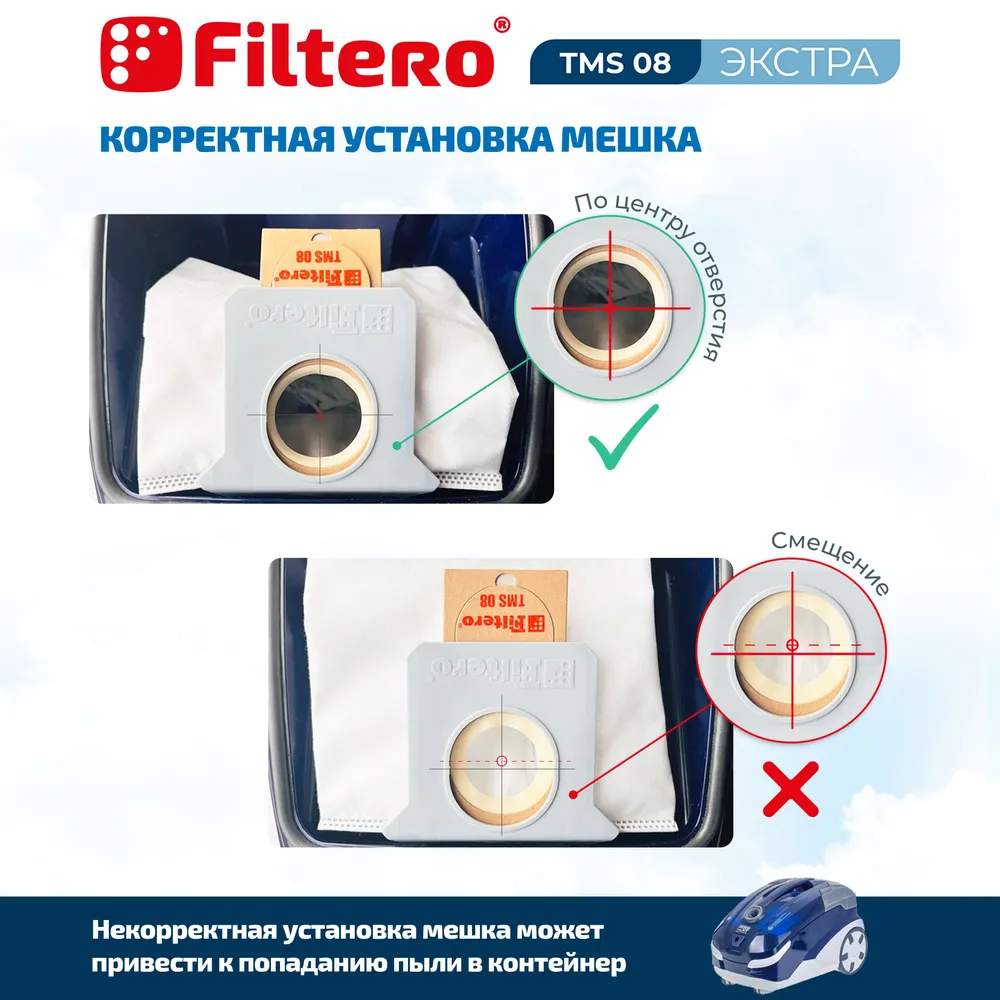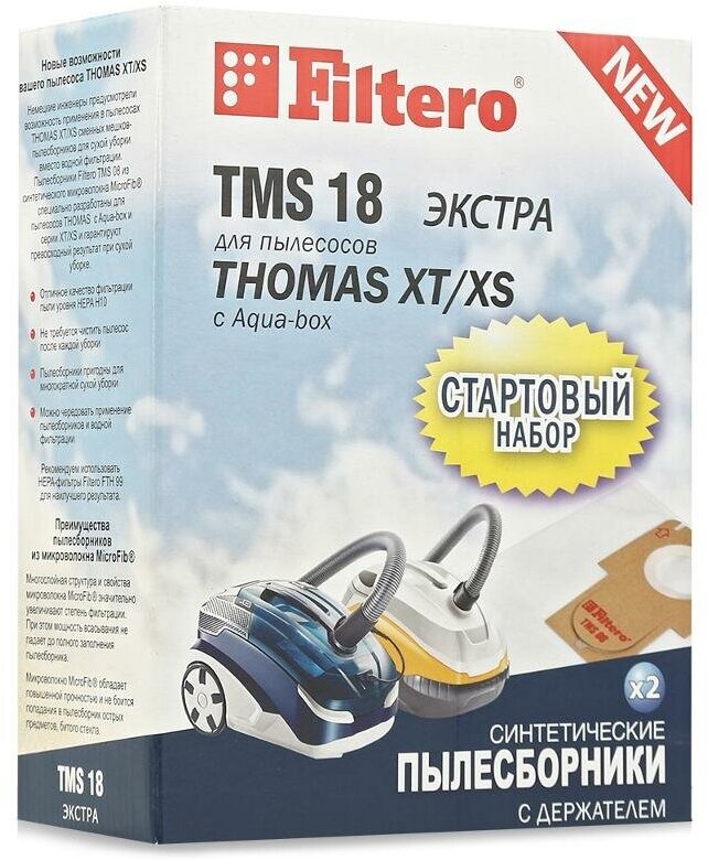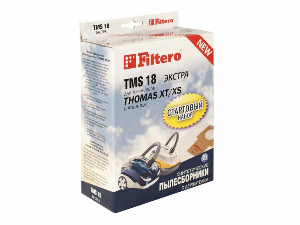Из синтетического микроволокна MicroFib, 5-слойные. Очень прочные, не боятся острых предметов и влаги, собирают больше (до 50%) пыли, чем бумажные. Обеспечивают уровень очистки воздуха НЕРА. В комплект входит 2 мешка-пылесборника TMS 08 и держатель Filtero.