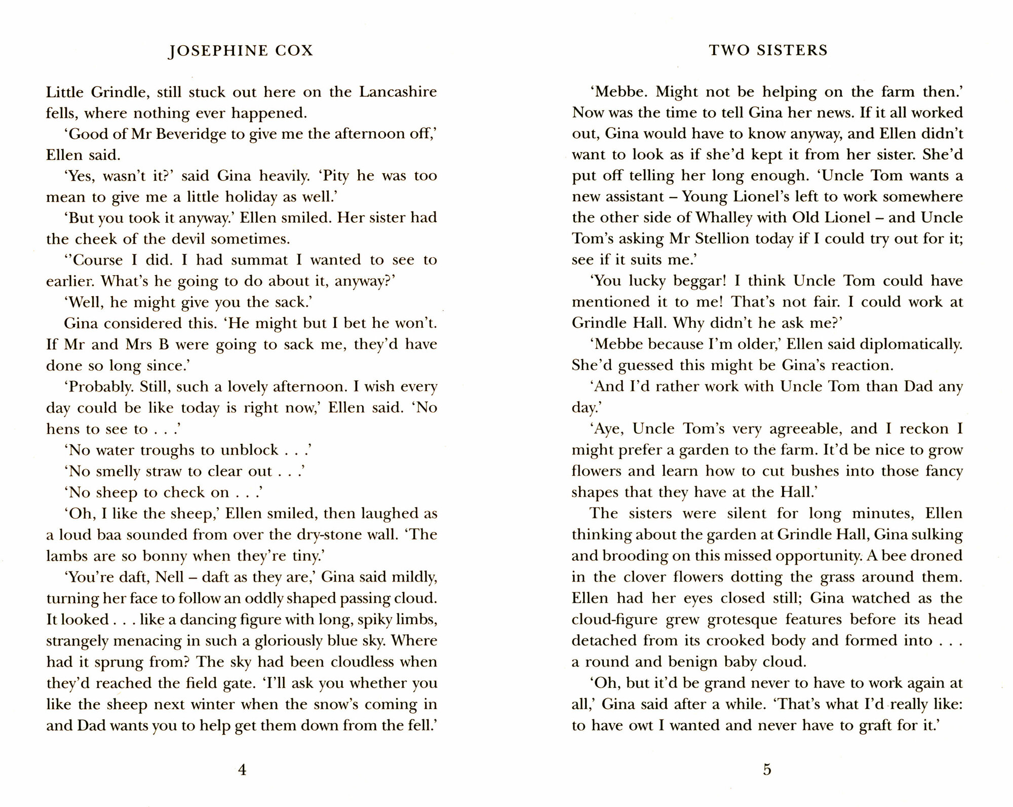 У Джозефины Кокс много читателей, но книга "Две сестры" наберёт ещё больше почитателей её таланта. Автор в этом произведение рассказывает о жизни в сельской местности, где великолепная природа, но есть и минусы - это каждодневная тяжёлая работа.