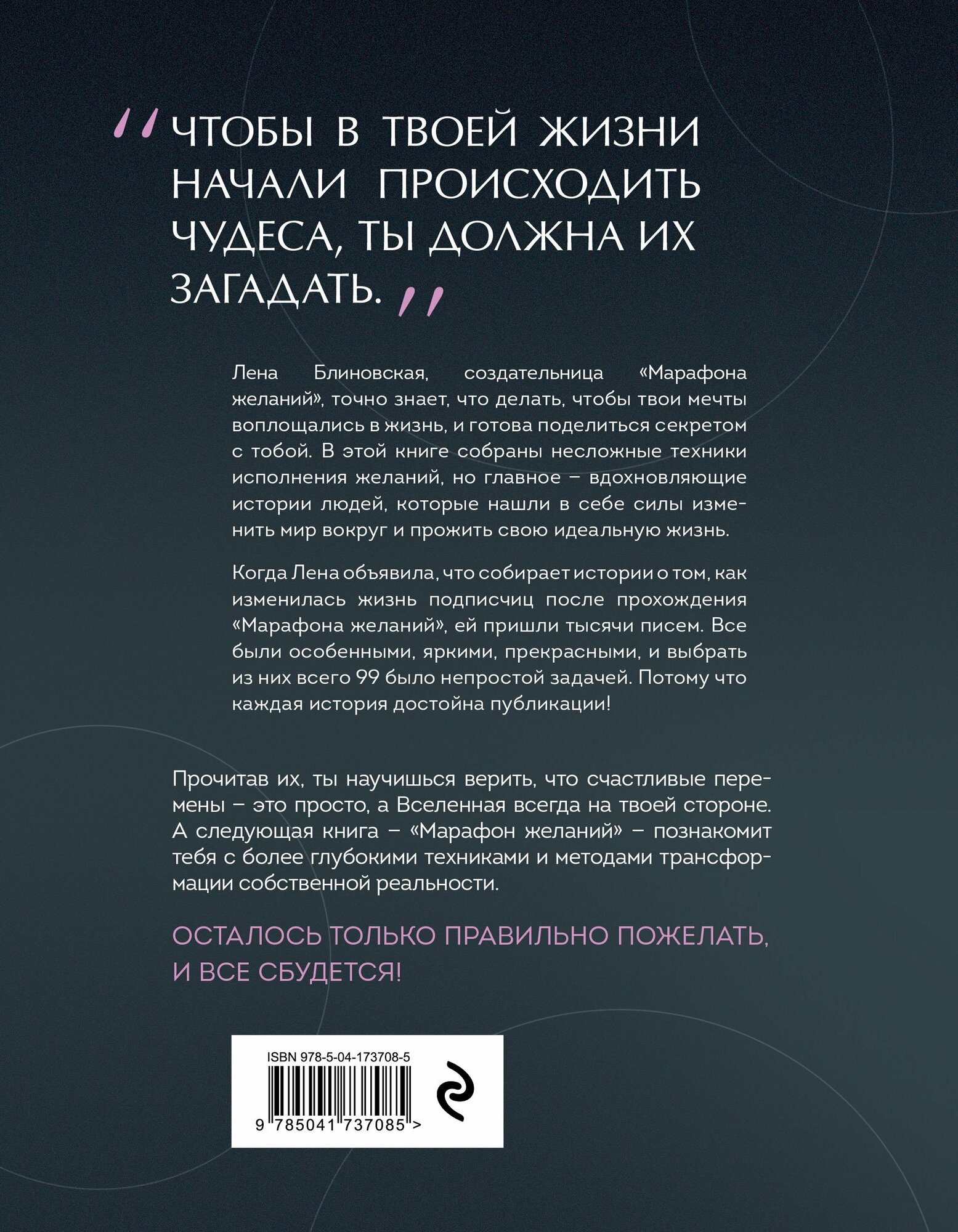 Также Елена собрала в своей книге 99 реальных историй. Это истории сбывшихся чудес, в каждой из которых - фрагмент чьей-то судьбы, путь от мечты к ее осуществлению и счастью. В них - мудрость и сила, которые вдохновляют, дарят истинную поддержку, опору и веру в собственные силы. У тебя есть возможность дополнить эти истории своими, записав их в Дневник желаний.