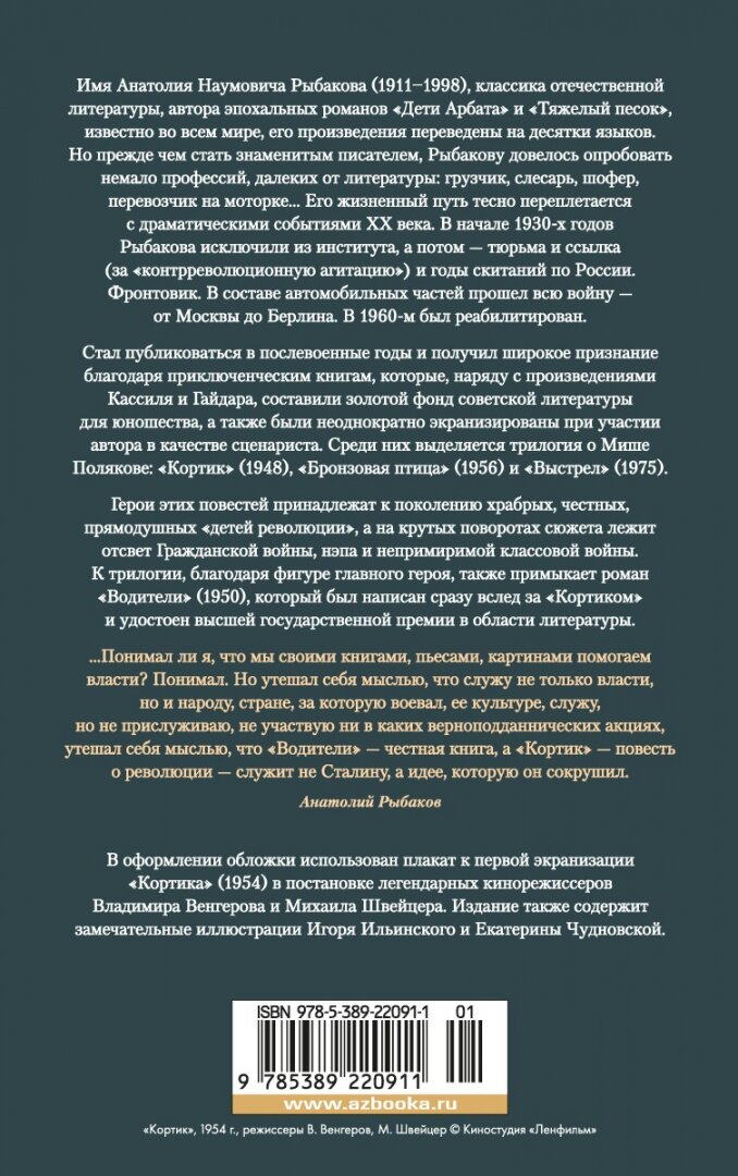 Имя Анатолия Наумовича Рыбакова (1911–1998), классика отечественной литературы, автора эпохальных романов «Дети Арбата» и «Тяжелый песок», известно во всем мире, его произведения переведены на десятки языков. Однако широкая известность пришла к Рыбакову задолго до публикации его главных романов. И самую большую популярность завоевали приключенческие книги, которые, наряду с произведениями Кассиля и Гайдара, составили золотой фонд советской литературы для юношества, а также были многократно экранизированы при участии автора в качестве сценариста. Среди них выделяется трилогия о Мише Полякове: «Кортик» (1948), «Бронзовая птица» (1956) и «Выстрел» (1975). Герои этих повестей принадлежат к поколению храбрых, честных, прямодушных «детей революции», а на крутых поворотах сюжета лежит отсвет Гражданской войны, нэпа и непримиримой классовой борьбы. К трилогии, благодаря фигуре главного героя, формально примыкает и роман «Водители» (1950), который был написан сразу вслед за «Кортиком» и удостоен высшей государственной премии в области литературы. В настоящем издании произведения Рыбакова публикуются с прекрасными иллюстрациями Игоря Ильинского и Екатерины Чудновской.