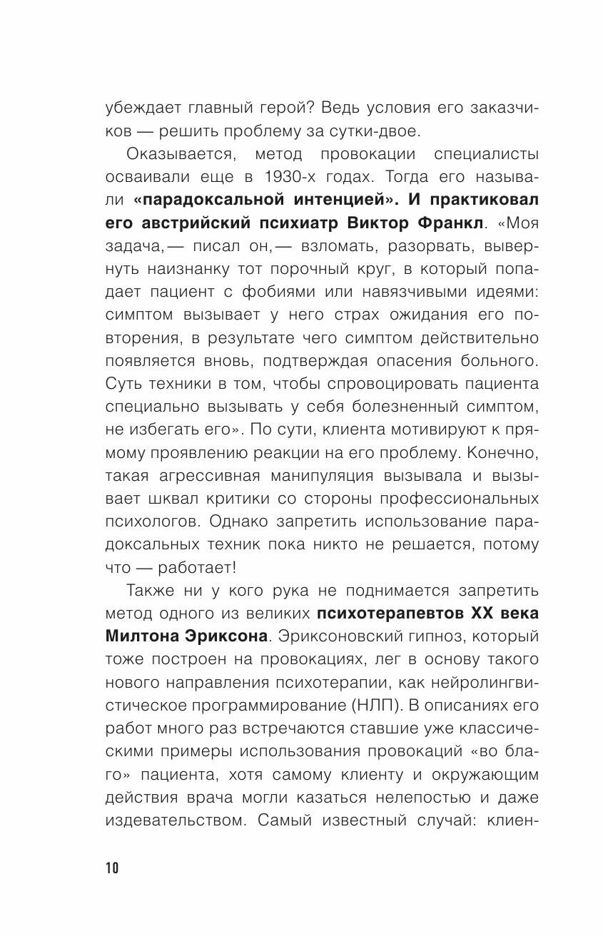 Вызов, эмоциональная встряска, "волшебный пендель" - или наглая манипуляция, сомнительный метод, нарушение профессиональной этики - провокативная психология вызывает множество споров и полярных реакций. Но что бы ни говорили ее противники - она работает. Работает зачастую там, где бессильны другие методы. В этой книге вы на ярких примерах познакомитесь со случаями из практики провокативных психологов. Каждый кейс сопровождается подробным объяснением того, в чем именно заключалась провокация, почему она сработала и как можно использовать этот метод для борьбы с нашими скрытыми страхами и проблемами.