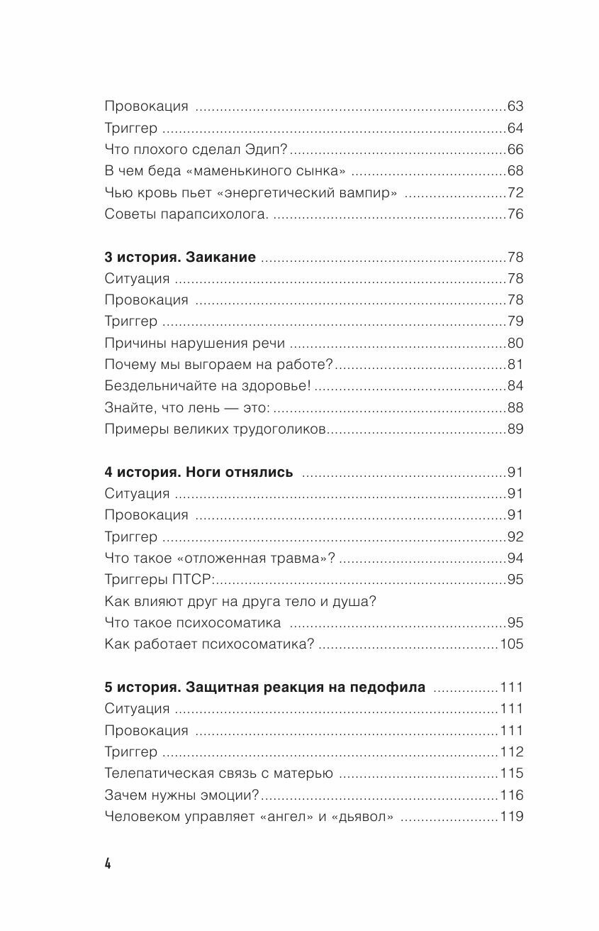 Потом на основе 10 разных серий сериала «Триггер» приведены 10 примеров с проблемами человеческой психики. Каждая глава имеет свою внутреннюю иерархию: