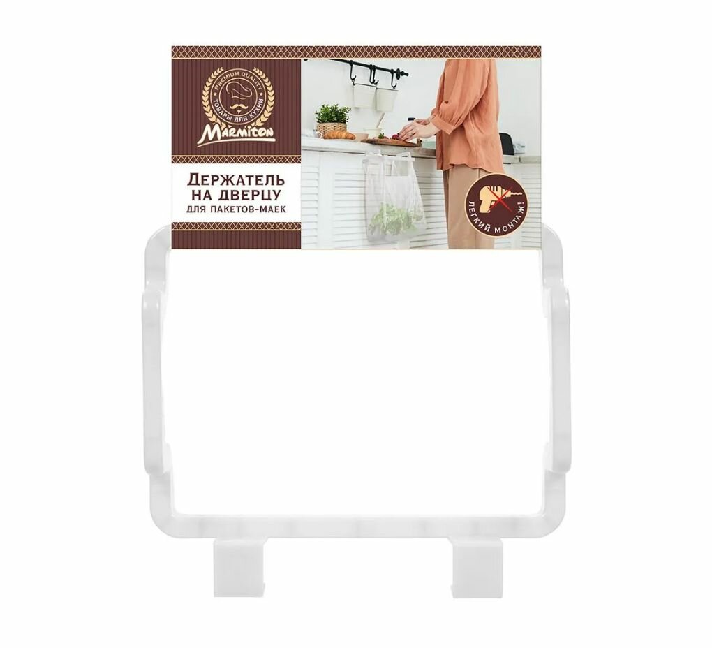Держатель на дверцу для пакетов-маек помогает поддерживать чистоту на кухне, может стать альтернативой мусорной корзине или использоваться дополнительно. Приспособление крепится на дверцу шкафа. Подходит для дверцы толщиной 1.8 см.