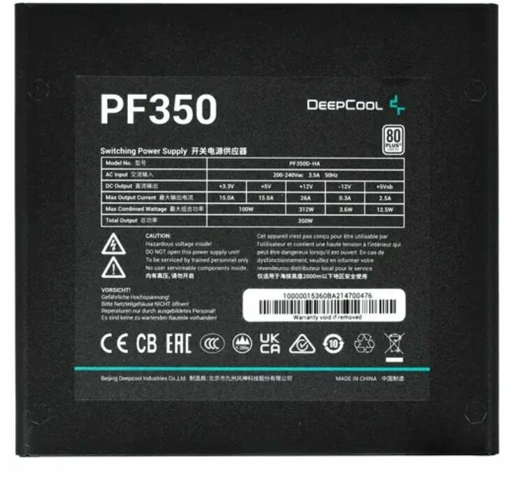 Блок питания DEEPCOOL PF350 [R-PF350D-HA0B-EU] с общей выходной мощностью по всем линиям 350 Вт сможет обеспечить стабильное питание компонентам системного блока, рассчитанного на работу с мультимедийными файлами или офисными документами. Он оборудован кабелями с основным разъемом питания 20 + 4 pin, интерфейсом для питания процессора 4+4 pin CPU, 6 разъемами SATA для накопителей, разъемами 6+2 pin x2 PCI-E для видеокарт. БП начального уровня DEEPCOOL PF350 [R-PF350D-HA0B-EU] относится к форм-фактору ATX и отличается подтвержденной сертификатом 80 PLUS Standart энергоэффективностью. Для стабильного отвода тепла в процессе работы он получает вентилятор 120x120 мм. Скорость вращения вентилятора регулируется через ШИМ в зависимости от текущей нагрузки блока питания. Сетевой кабель поставляется вместе с БП.