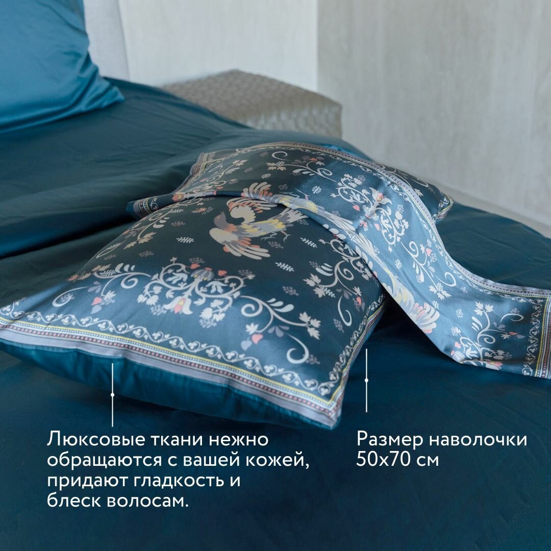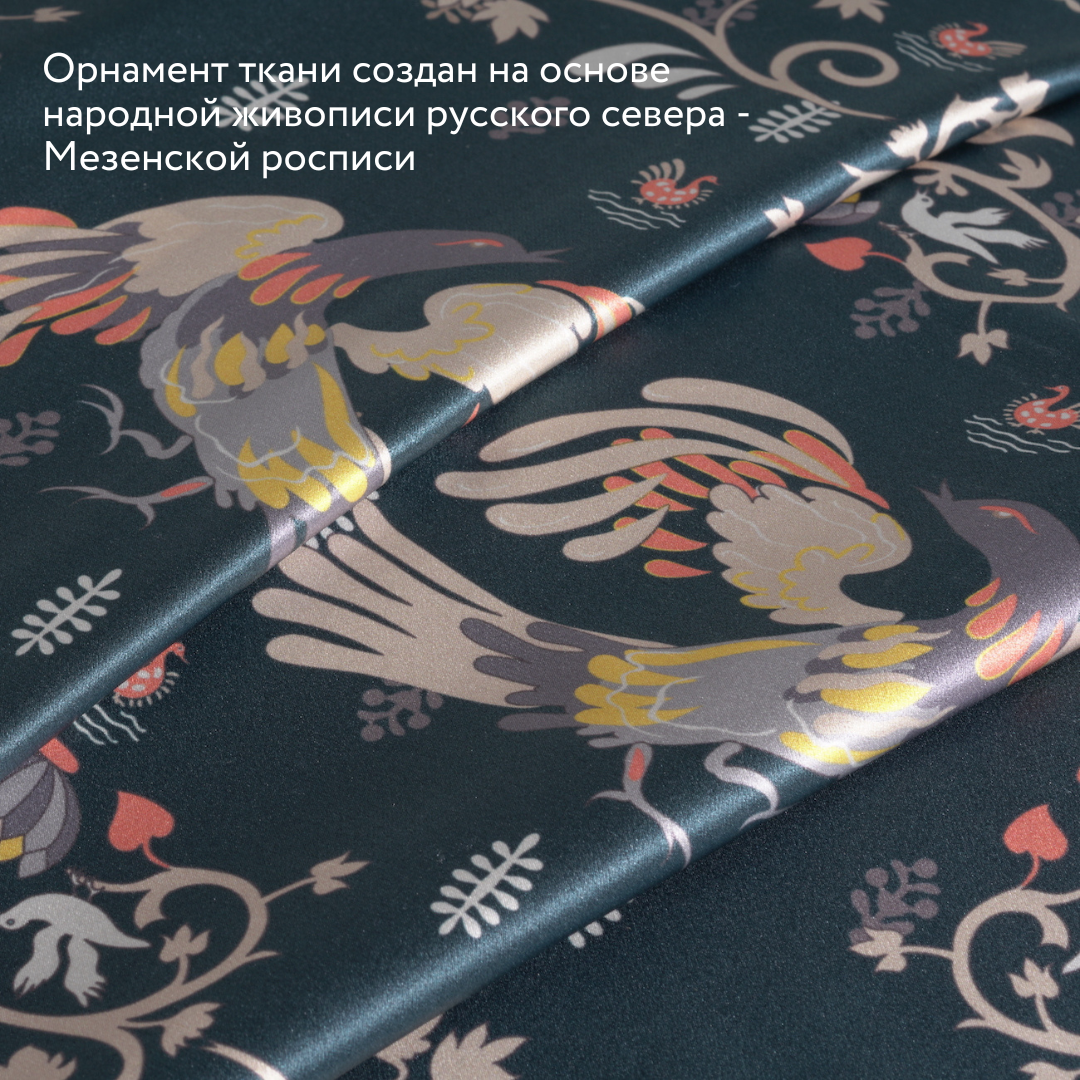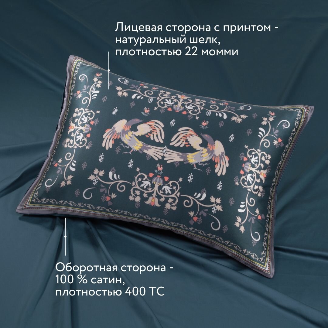 Наволочка Mollen Сказки. Мезенская роспись в темно-бирюзовом шелк и сатин (05.02.03.08)