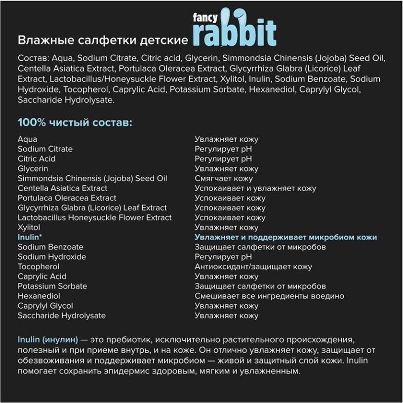 Fancy Rabbit - инновационные детские влажные салфетки. Влажные салфетки Fancy Rabbit прочнее любых существующих салфеток в 7 раз, за счет увеличенной плотности материала, мы добавили пребиотик (инулин) - защищает микробиом кожи, увлажняет и успокаивает чувствительную кожу ребенка. мы сделали очень удобную упаковку - всего 25 шт. с плотно закрывающейся крышкой и Блок из 3-х таких упаковок. При производстве влажных салфеток Fancy Rabbit нет используется хлора и ароматизаторы. Они подойдут для всей семьи. Inulin(инулин)- это пребиотик, исключительно растительного происхождения, полезный и при приеме внутрь, и на коже. Он отлично увлажняет кожу, защищает от обезвоживания и поддерживает микробиом-живой и защитный слой кожи. Inulin помогает сохранить эпидермис здоровым, мягким и увлажненным. 100% чистый состав: Aqua-Увлажняет кожу Sodium Citrate-Регулирует pH Citric acid- Регулирует pH Glycerin-Увлажняет кожу Simmondsia Chinensis (Jojoba) Seed Oil-Смягчает кожу Centella Asiatica Extract-Успокаивает и увлажняет кожу Portulaca Oleracea Extract-Успокаивает кожу Glycyrrhiza Glabra( Licorice) Leaf Extract- Успокаивает кожу Lactobacillius/Honeysuckle Flower Extract- Успокаивает кожу Xylitol- Увлажняет кожу Inulin- Увлажняет и поддерживает микробиом кожи Sodium Benzoate-Защищает салфетки от микробов Sodium Hydroxide- Регулирует pH Tocopherol-Антиоксидант/защищает кожу Caprylic Acid- Увлажняет кожу Potassium Sorbate-Защищает салфетки от микробов Hexanediol-Смешивает все ингредиенты воедино Caprylyl Glycol- Увлажняет кожу Saccharide Hydrolysate- Увлажняет кожу