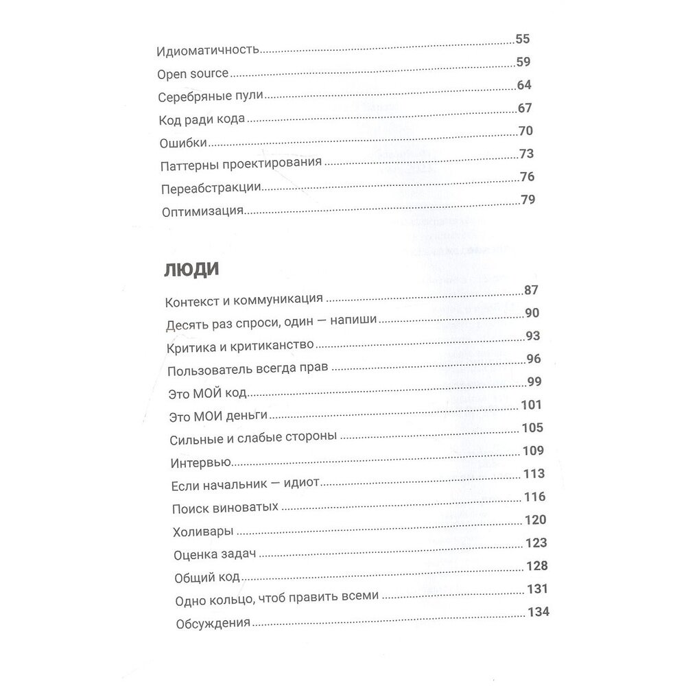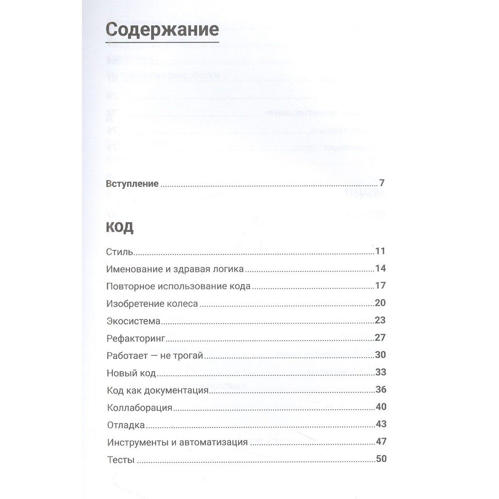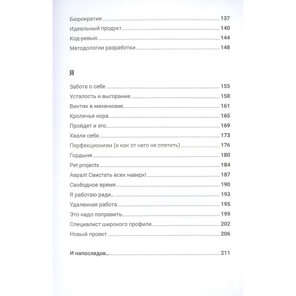 Книга Владимира Швеца, востребованного разработчика с 15-летним опытом работы, поможет вам не сойти с пути и преодолеть все трудности с честью. Она содержит исчерпывающие сведения о проблемах каждого разработчика и способах их решения. Вы узнаете, как писать хороший, чистый код, отлаживать его и оптимизировать, настроить удобный для себя режим работы и без труда общаться с коллегами и руководителями, как справляться с усталостью, выгоранием и гордыней. Каждый раздел содержит непридуманные истории из опыта автора и его коллег, маленькие хитрости и лайфхаки, а также задания, которые помогут вам подготовиться к грядущим испытаниям на пути к новым высотам в карьере.