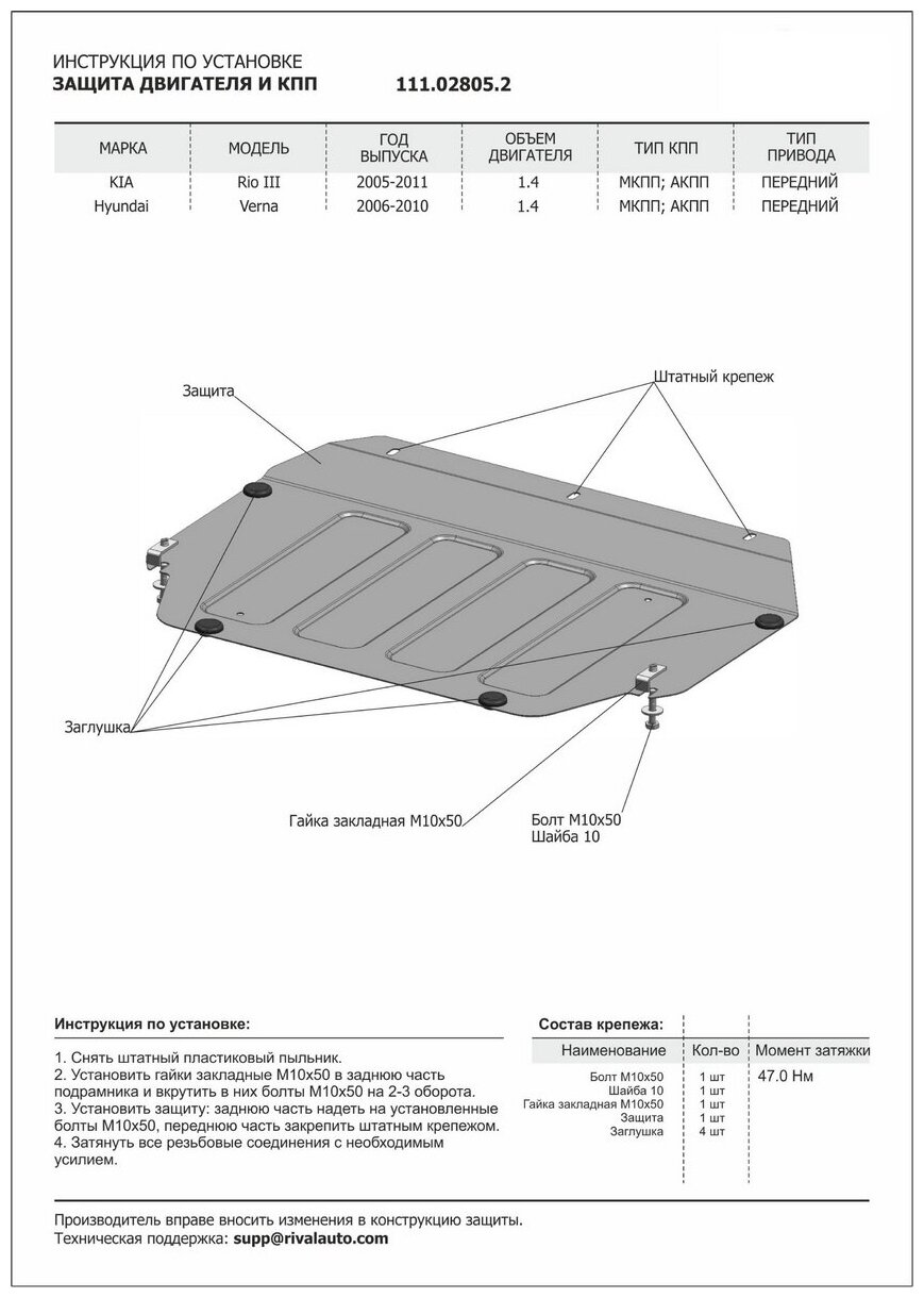 | Комплектация | защита - 1 шт., комплект крепежа, инструкция по установке, упаковка |