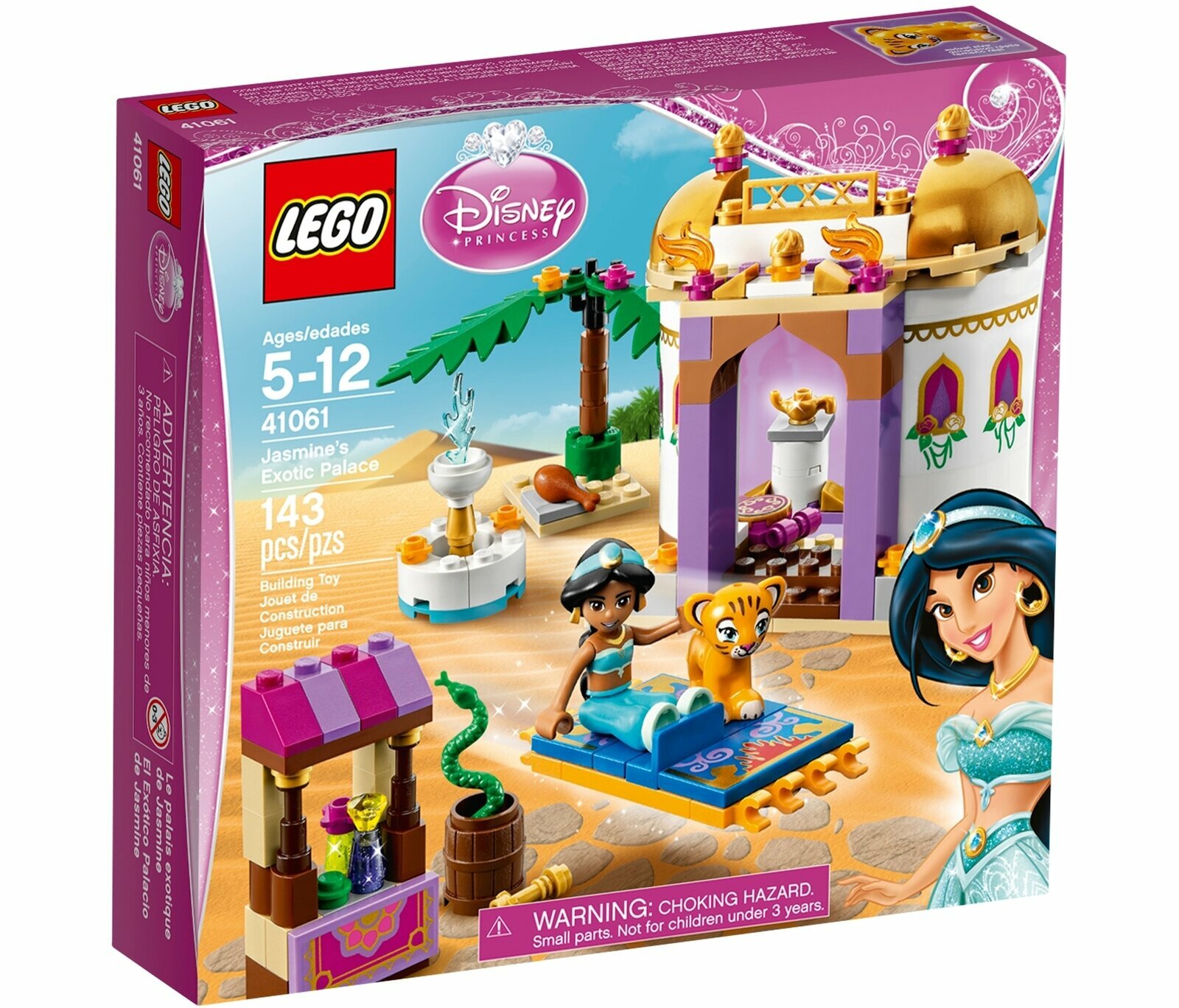 Игровой набор LEGO Disney - отличный способ воссоздать самые яркие эпизоды из всеми любимых волшебных диснеевских мультфильмов. Добро пожаловать в Аграбу, дом Принцессы Жасмин. Строй и играй с Принцессой и её ручным тигром Раджой во дворе дворца. С чего сегодня начать? Отдохнуть у фонтана или отправиться в увлекательное путешествие на ковре-самолете? Пройтись по шумному базару и посмотреть на заклинателя змей? Всё зависит от тебя! Набор совместим с другими наборами серии Disney.