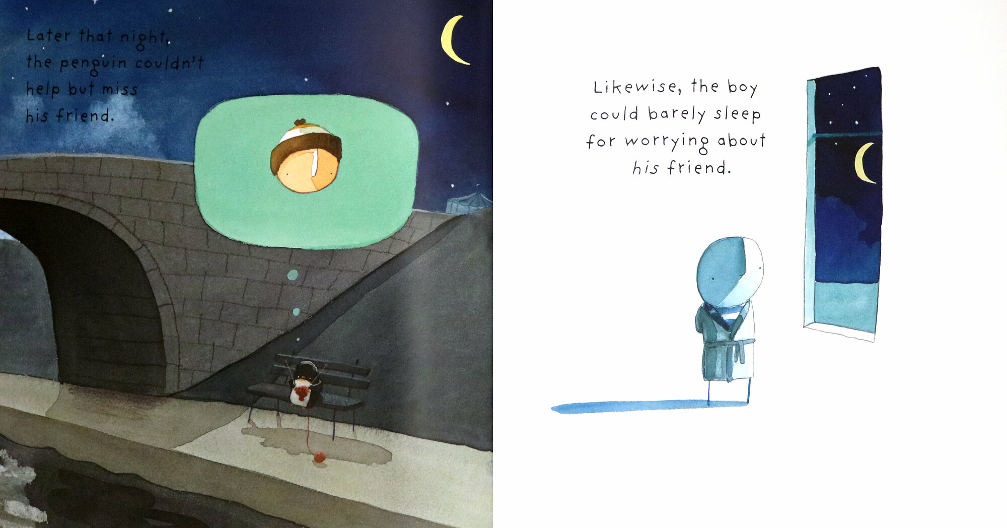 Running away, the penguin visits place after place, searching for a chance to get his feet off the ground. But will flying be everything he had hoped? And is the boy missing him, as much as he is missing the boy?
